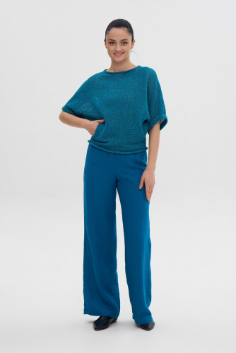 Джемпер трикотажный женский цельновязаный без боковых и плечевых швов. Вырез горловины в форме «лодочка». Спереди вывязанные карманы. По низу рукава отворот.