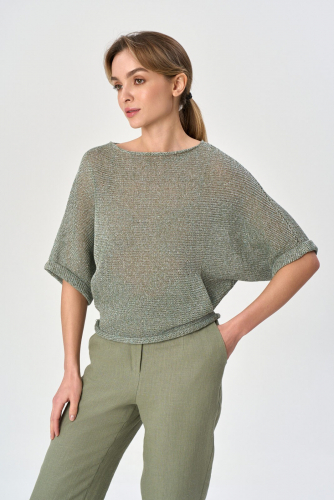 Джемпер трикотажный женский цельновязаный без боковых и плечевых швов. Вырез горловины в форме «лодочка». Спереди вывязанные карманы. По низу рукава отворот.