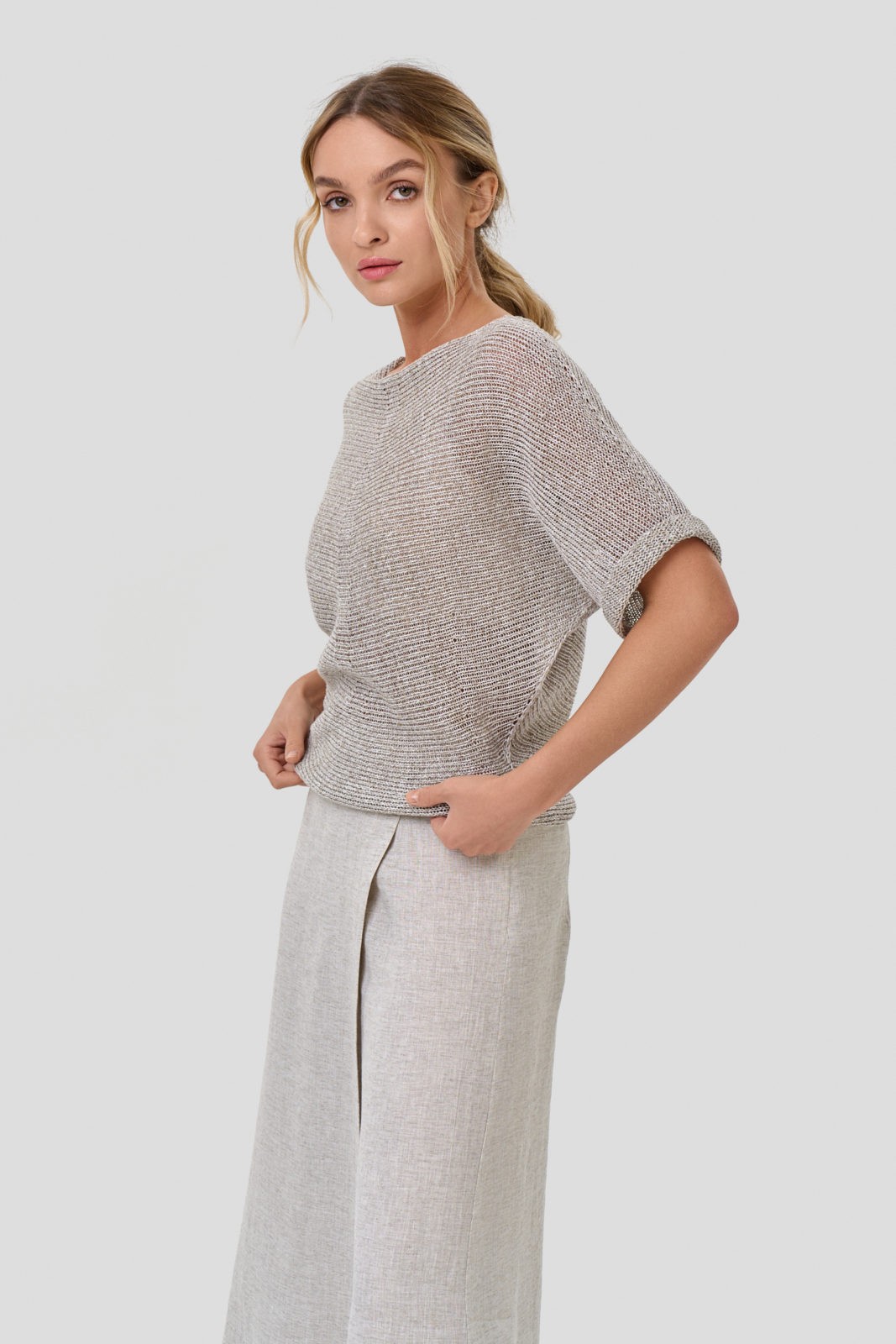 Джемпер женский цельновязаный без боковых и плечевых швов с расширенным объемом в верхней части. Рукав до локтя с отворотом по низу. Вырез горловины лодочка.