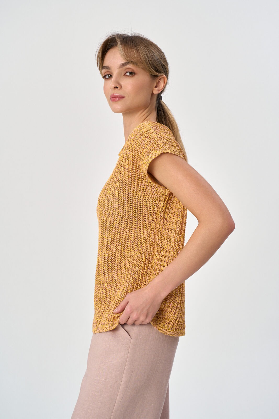 Жилет трикотажный переплетения «полуфанг» среднего обьема, короткий. Спущенное плечо. Вырез горловины лодочка.
