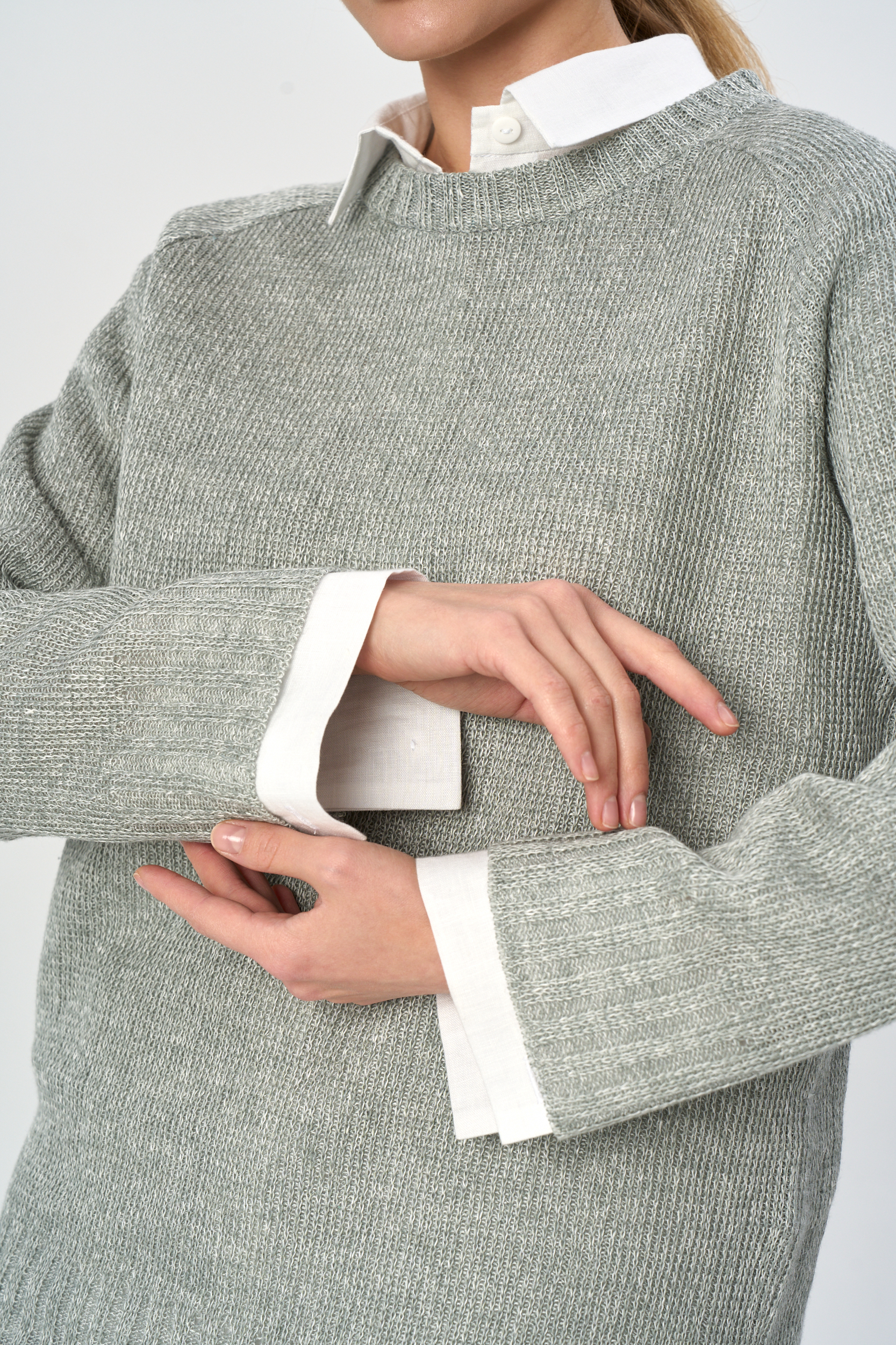 Свитер трикотажный устойчивого переплетения среднего объема длиной до середины бедра. Вырез горловины округлой формы. Рукав – реглан длинный.