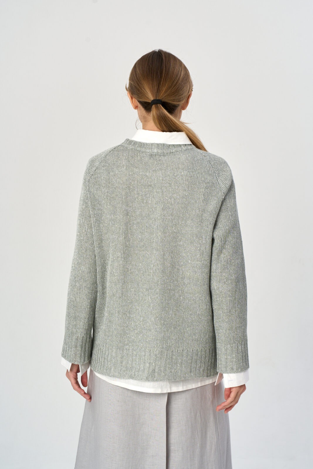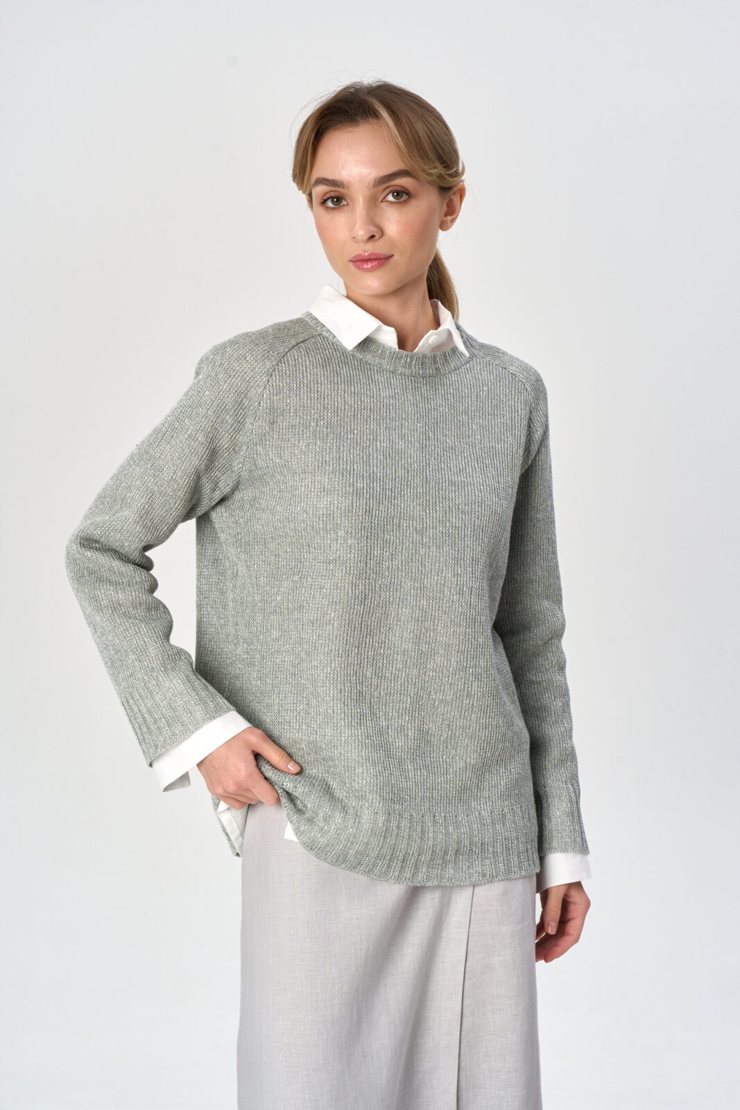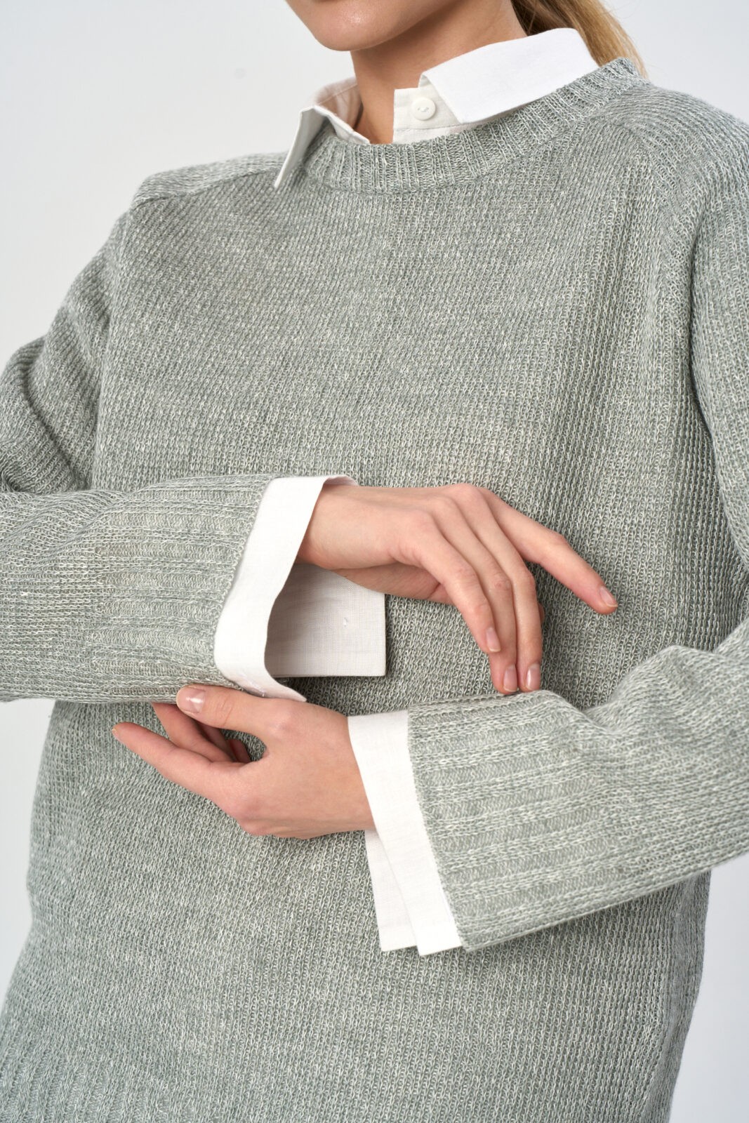 Свитер трикотажный устойчивого переплетения среднего объема длиной до середины бедра. Вырез горловины округлой формы. Рукав – реглан длинный.