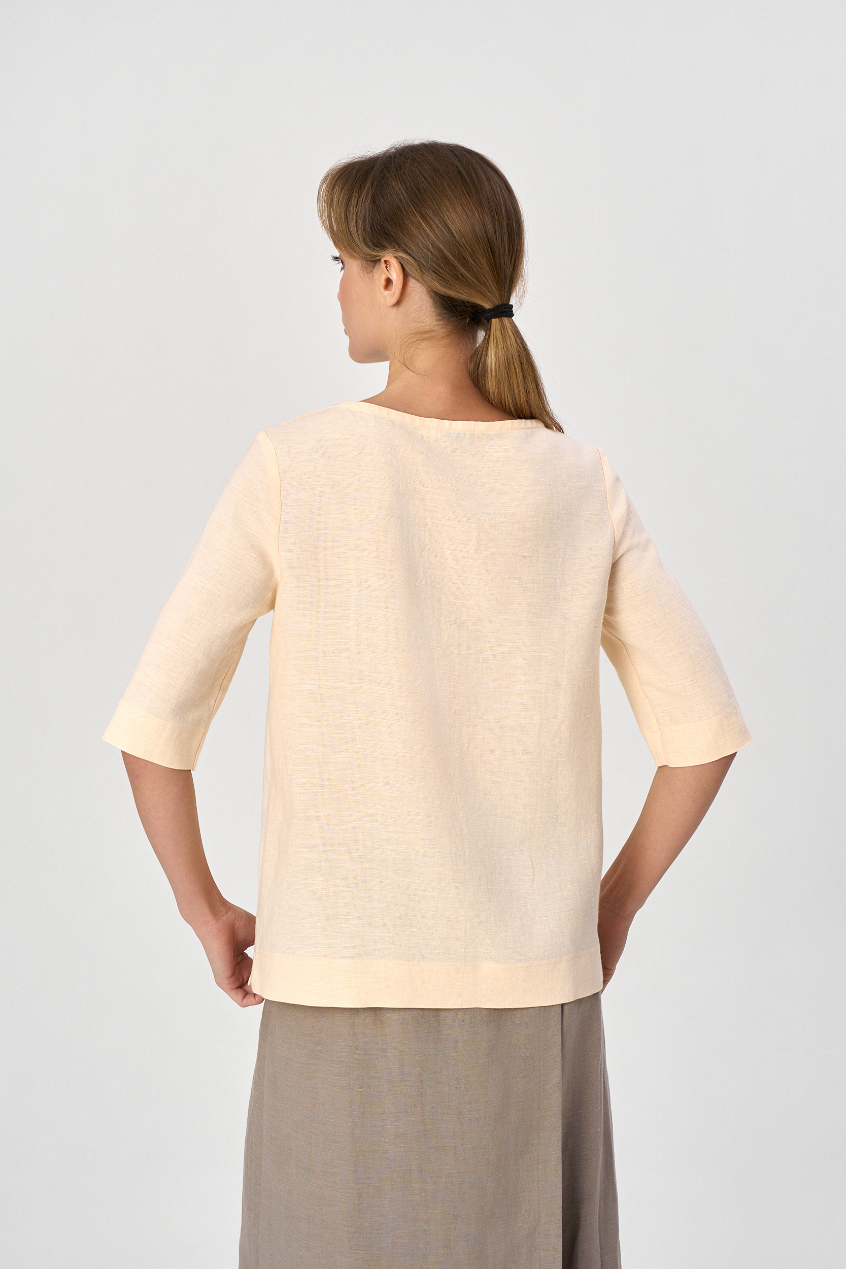 Блузка прямого силуэта длиной до середины бедра. Вырез горловины V-образной формы Рукав втачной до локтя.
