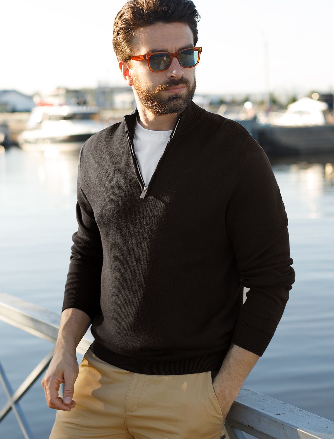Для изготовления светло-синего джемпера с воротом, застегивающимся на молнию, использовали мягкий трикотаж, связанный из премиального хлопка с добавлением акрила. Двуслойное жаккардовым плетение, вязка с фактурой типа «пике», благодаря чему джемпер имеет среднюю плотность, эластичноть и, при этом, формоустойчивость. Греет за счет иск.шерсти (ПАН) в составе, а премиальный хлопок помогает защитить изделие от скатывания. Такой состав гигроскопичен, греет, но абсолютно не колет
