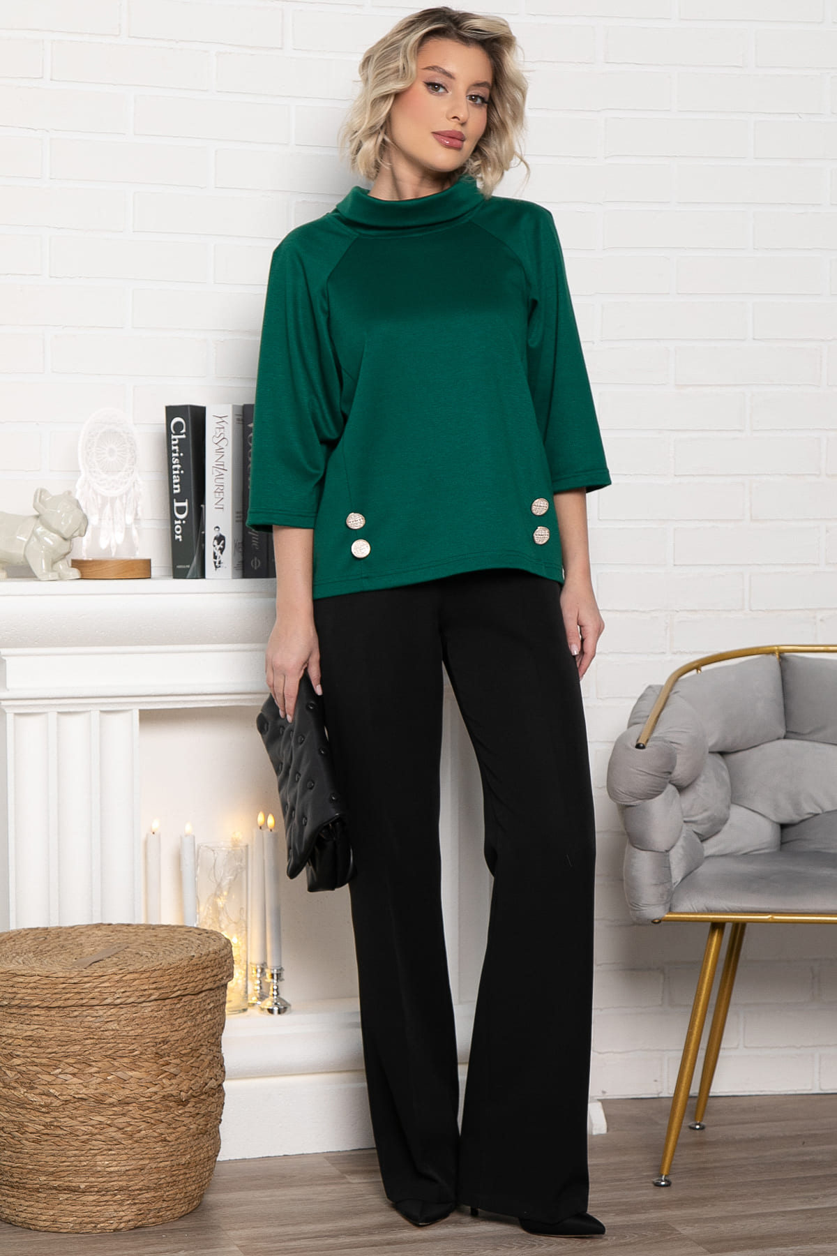 Джемпер прямого кроя в изумрудном оттенке с воротником-хомутом идеально подходит для создания стильного и удобного образа. Декоративные пуговки на передней части джемпера придают ему изящный и привлекательный вид. Подойдет как для повседневной жизни, так и для более формальных мероприятий. Он идеально сочетается с разными стилями и аксессуарами, позволяя создать уникальный и стильный образ. Рукав-реглан средней длины 3/4.