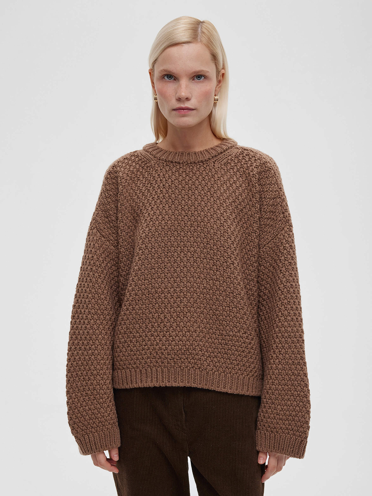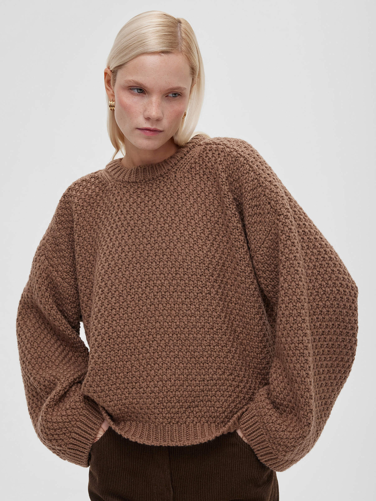 Джемпер из фактурного вязаного трикотажа, с цельным плечом и круглым горлом.
