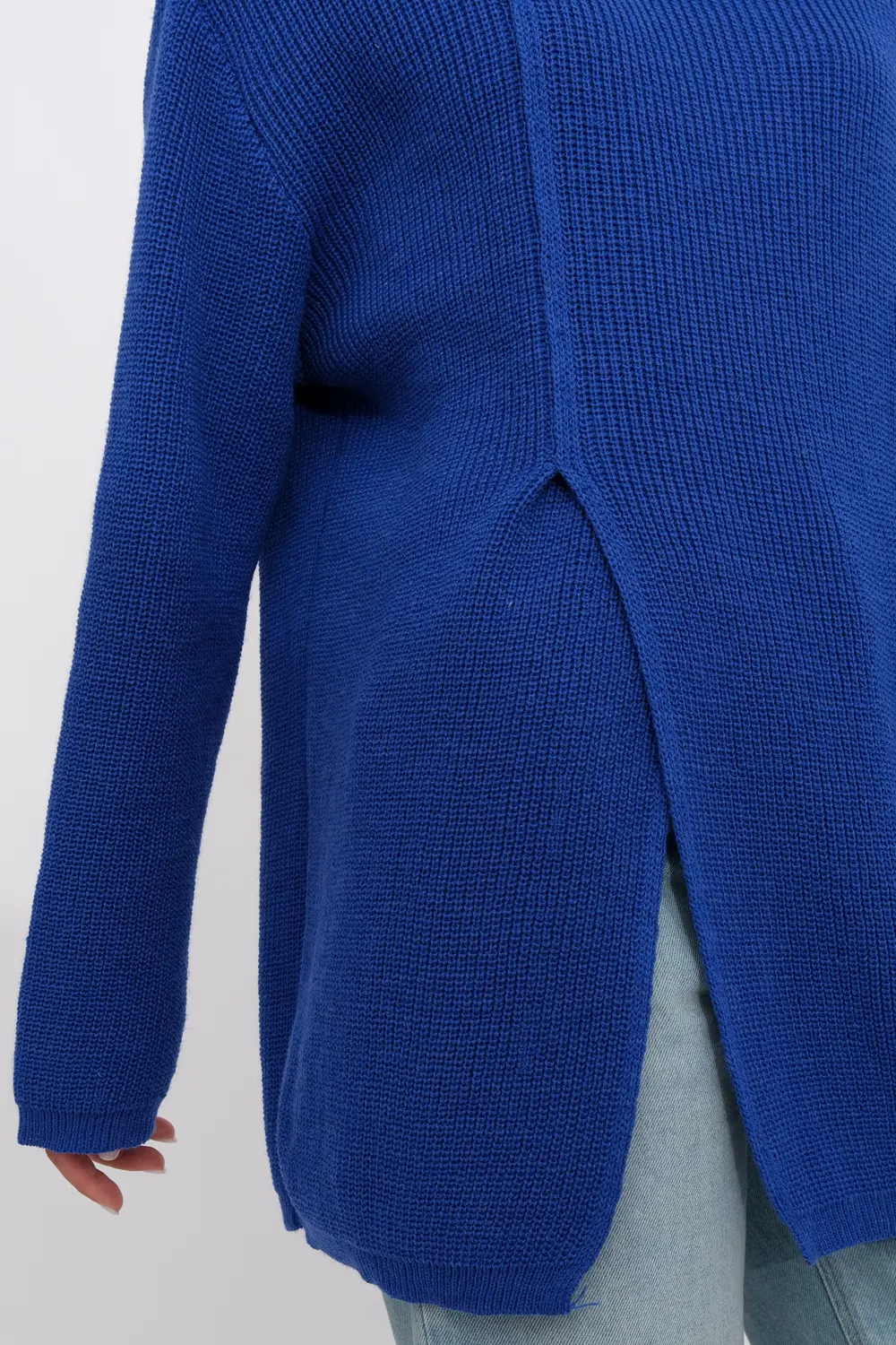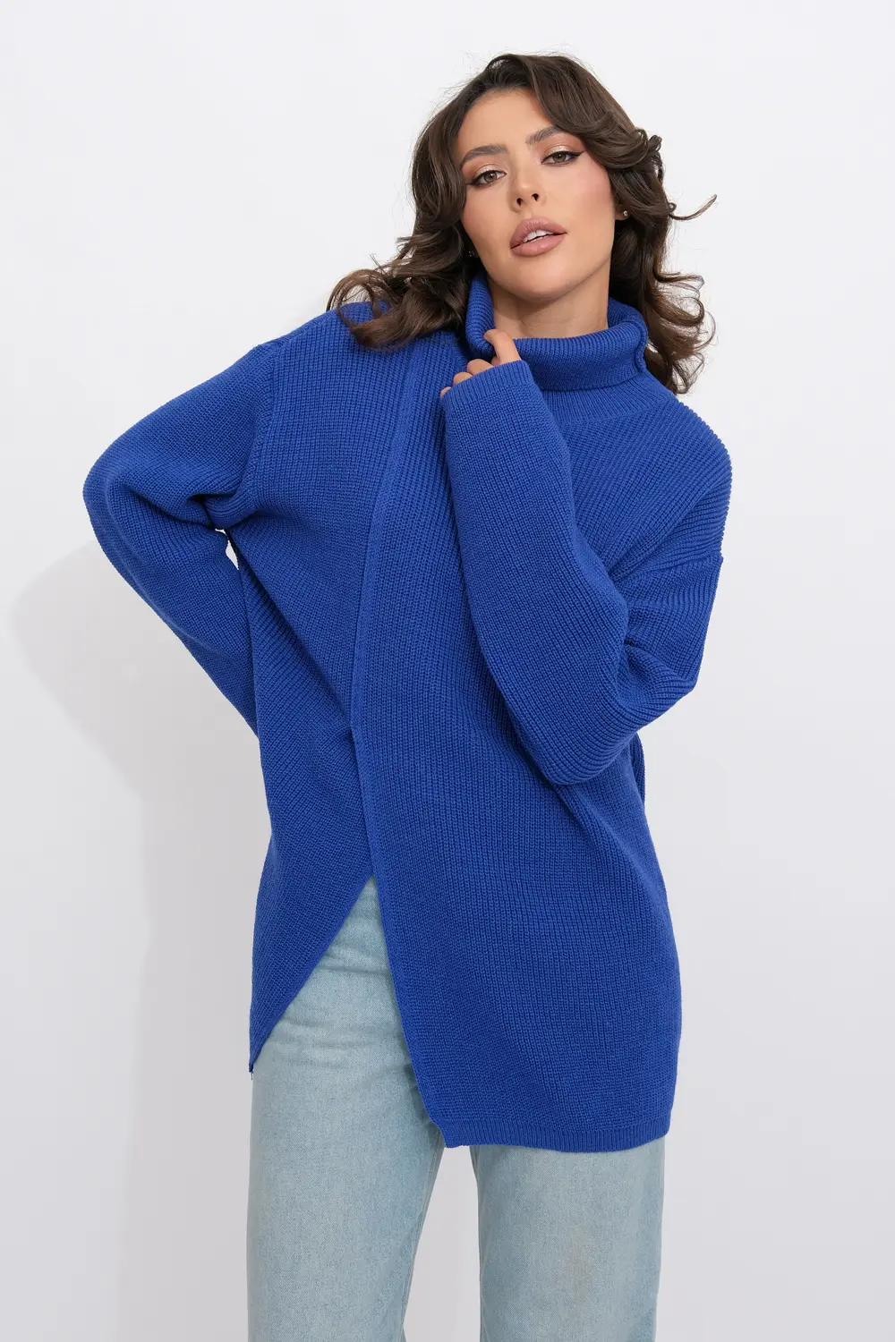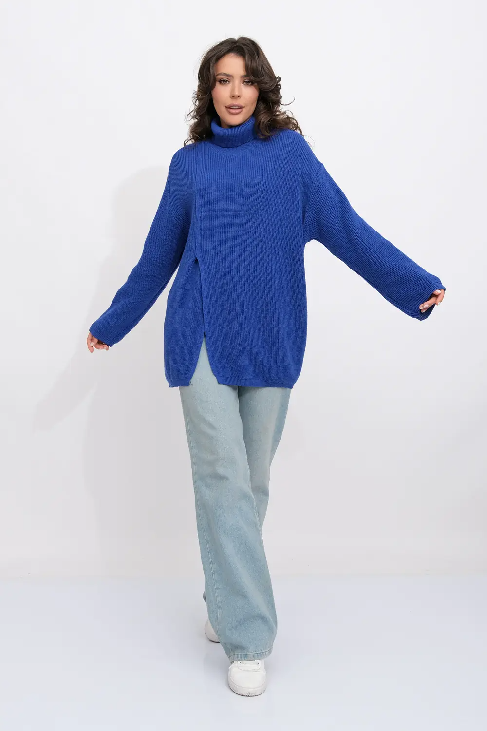 Джемпер оверсайз с воротом-стойкой. Рукава длинные со спущенным плечом. По переднему полотну изделия сбоку стильный глубокий разрез. василек