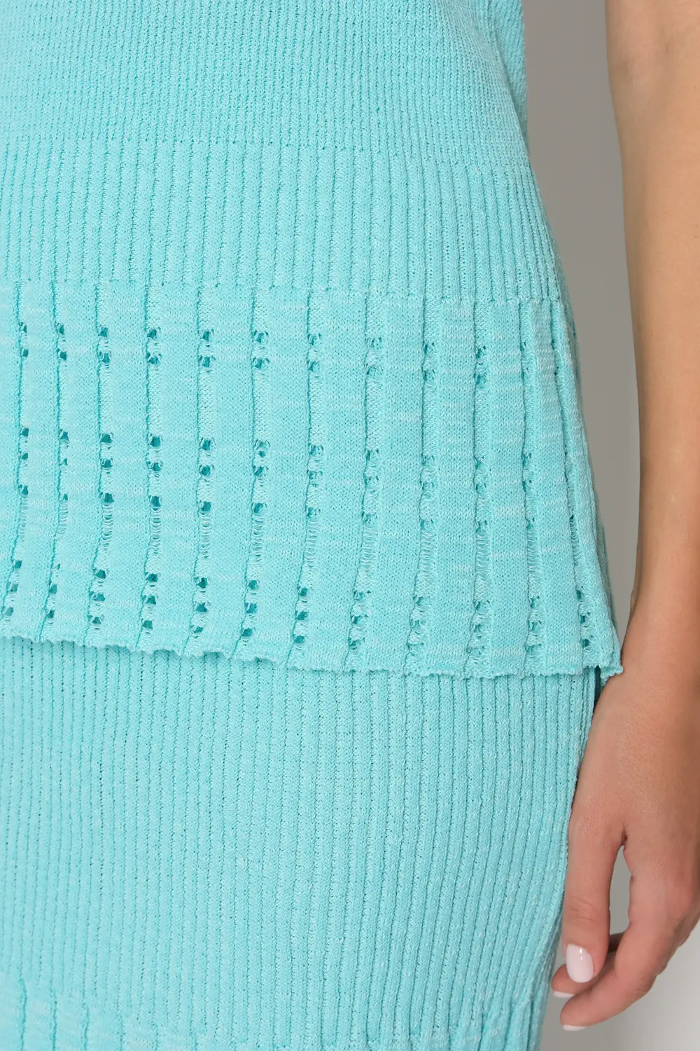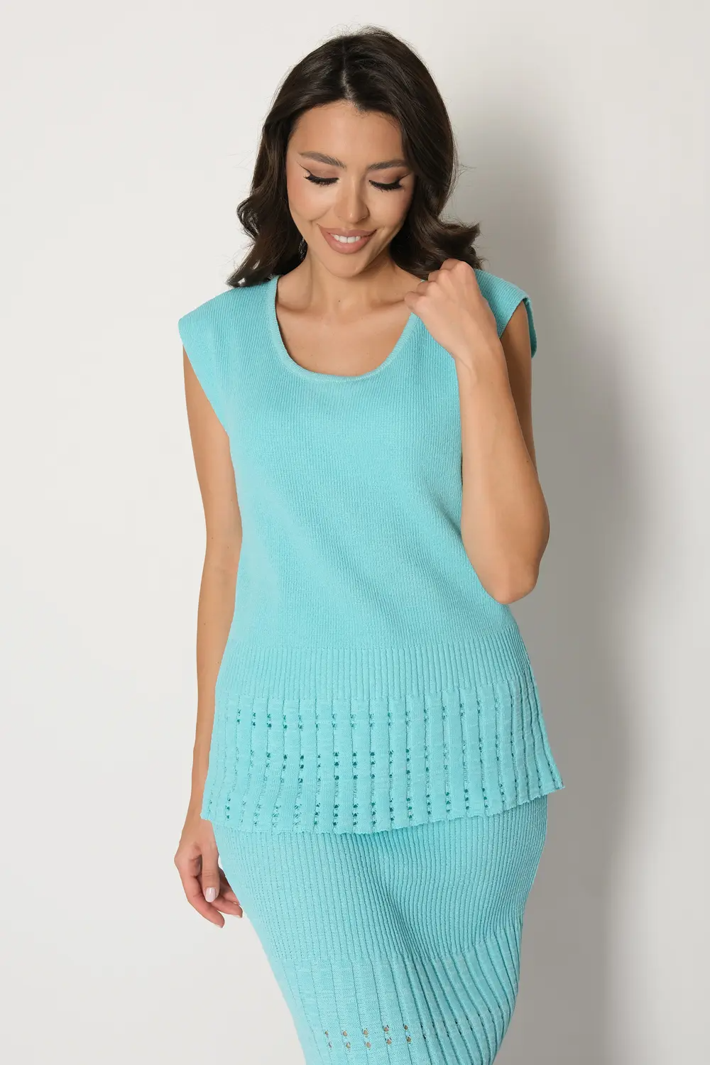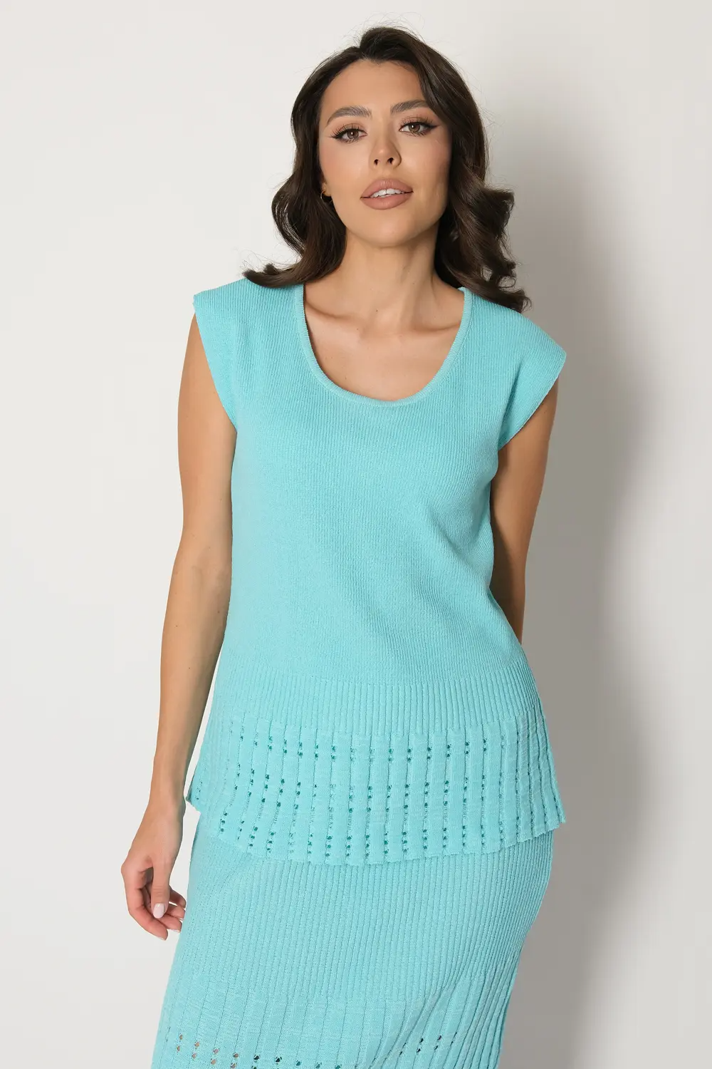 Женский вязаный джемпер полуприлегающего силуэта со спущенным плечом. Джемпер выполнен кулирной гладью, нижняя треть изделия переплетением-лапша с эффектом перфорации. Джемпер можно носить в комплекте с юбкой, вывязанной аналогичным переплетением и узором. Артикул юбок И 014, И 014дл, И 017. мятный