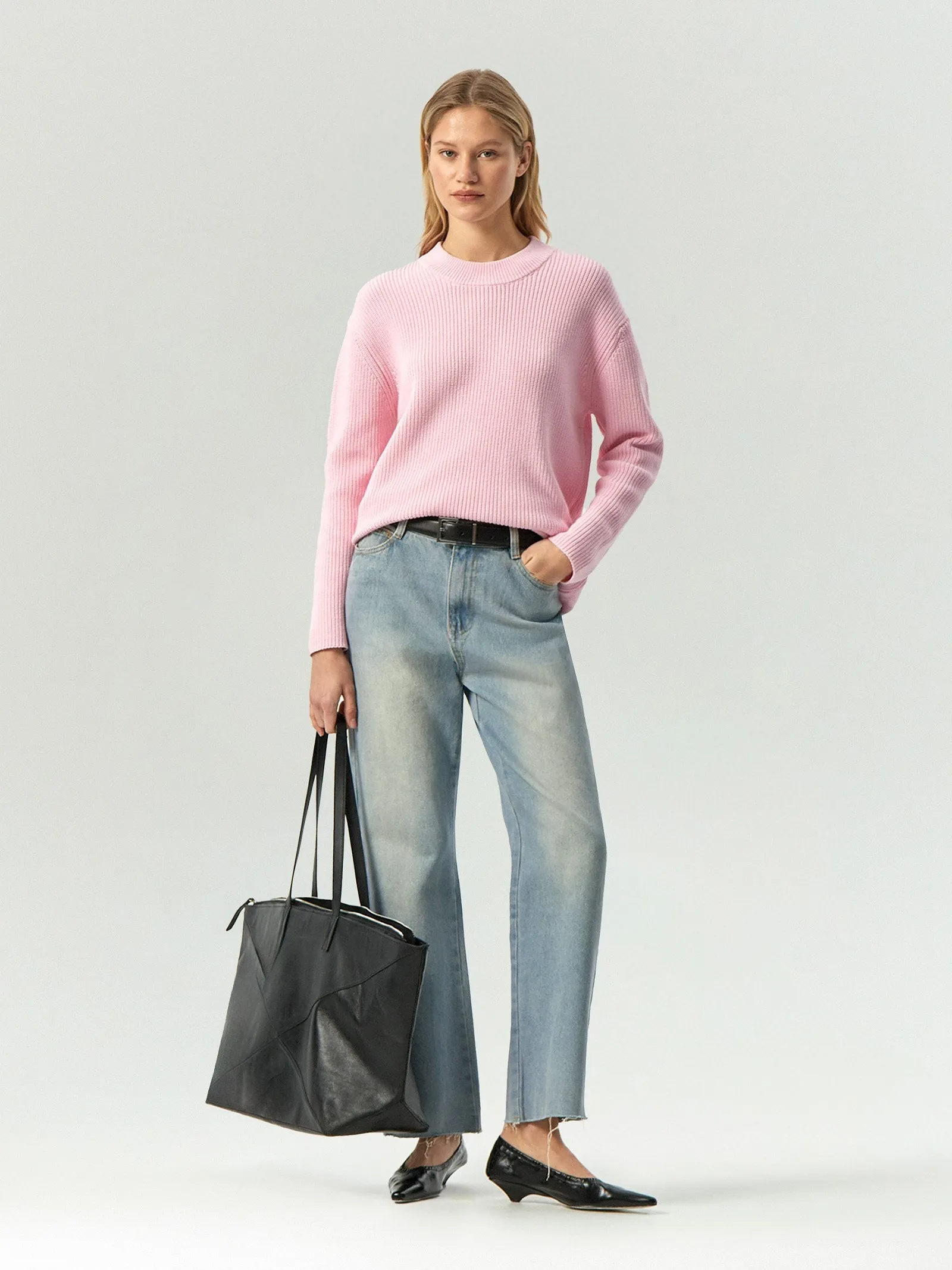 Свитер крупной вязки из натурального хлопка радует глаз мягким оттенком розового. Модель оверсайз можно стилизовать ремнями, использовать как второй слой на комбинации и лёгкие платья, носить с юбками разных фактур, денимом и костюмными брюками.