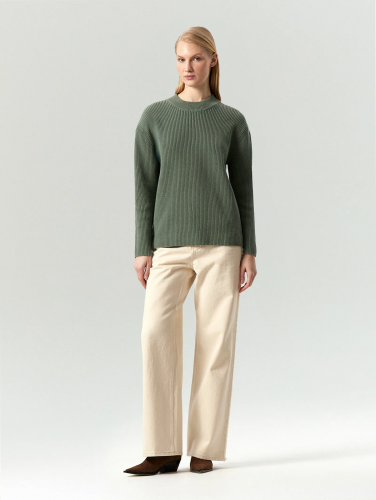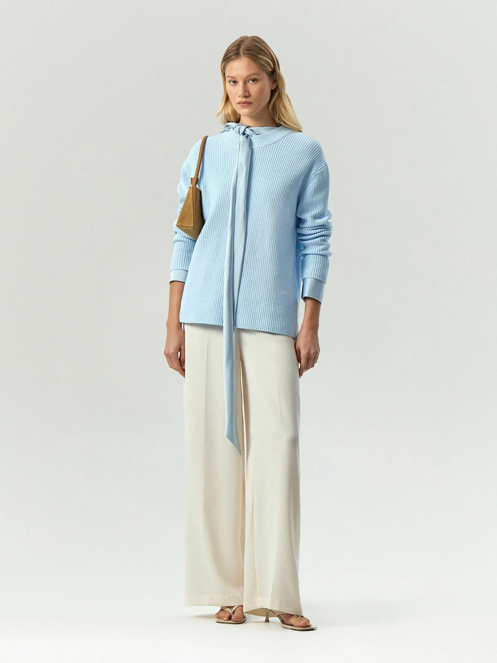 Свитер крупной вязки из натурального хлопка радует глаз мягким оттенком голубого. Модель оверсайз можно стилизовать ремнями, использовать как второй слой на комбинации и лёгкие платья, носить с юбками разных фактур, денимом и костюмными брюками.