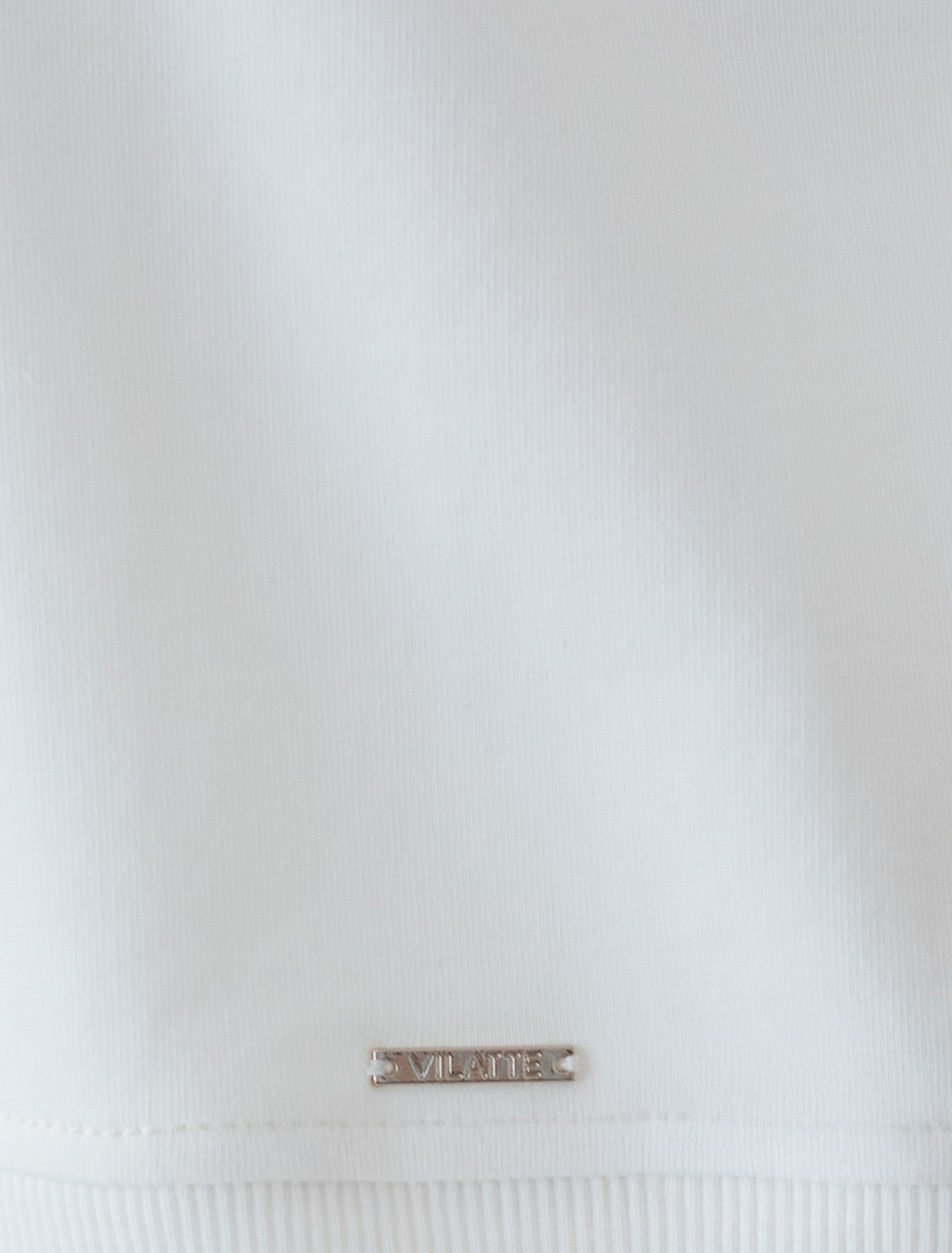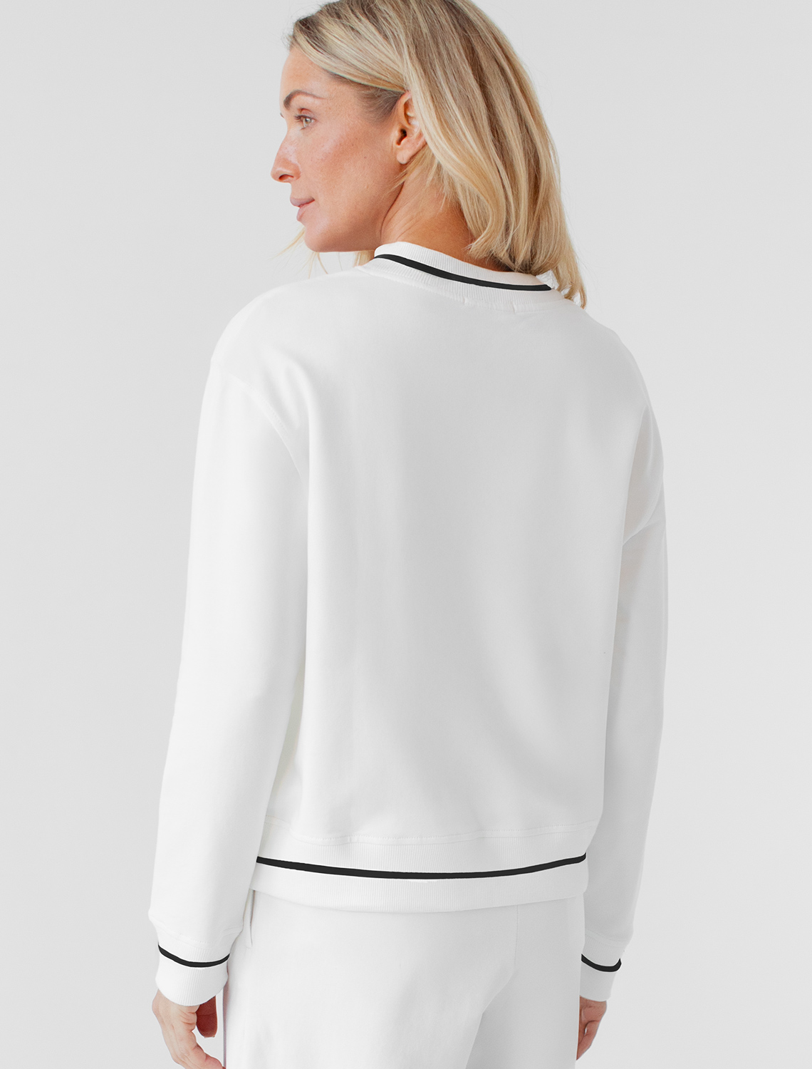 Перевод принта: Теннисный клуб. Джемпер умеренного объема с V-вырезом выполнен из эластичного футера двухнитки. Горловина, манжеты и пояс выполнены из эластичного хлопка с контрастной полосой. Изделие дополнено золотистым логотипом бренда. Сочетается в костюме с брюками D44.141, D44.142, шортами D48.009 и юбкой-шортами D46.041