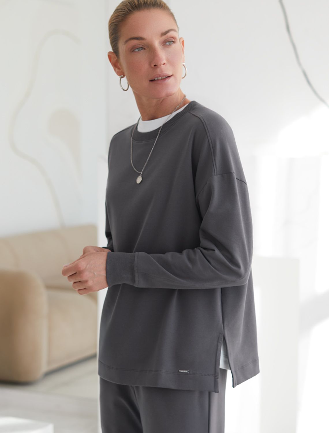 Джемпер со спущенной линией плеча выполнен из премиального хлопка. Модель дополнена разрезами по бокам. Мягкий эластичный хлопковый трикотаж гарантирует исключительный комфорт и уют дома. Идеально сочетается в костюме с шортами D48.006, брюками D44.120 и леггинсами D44.131