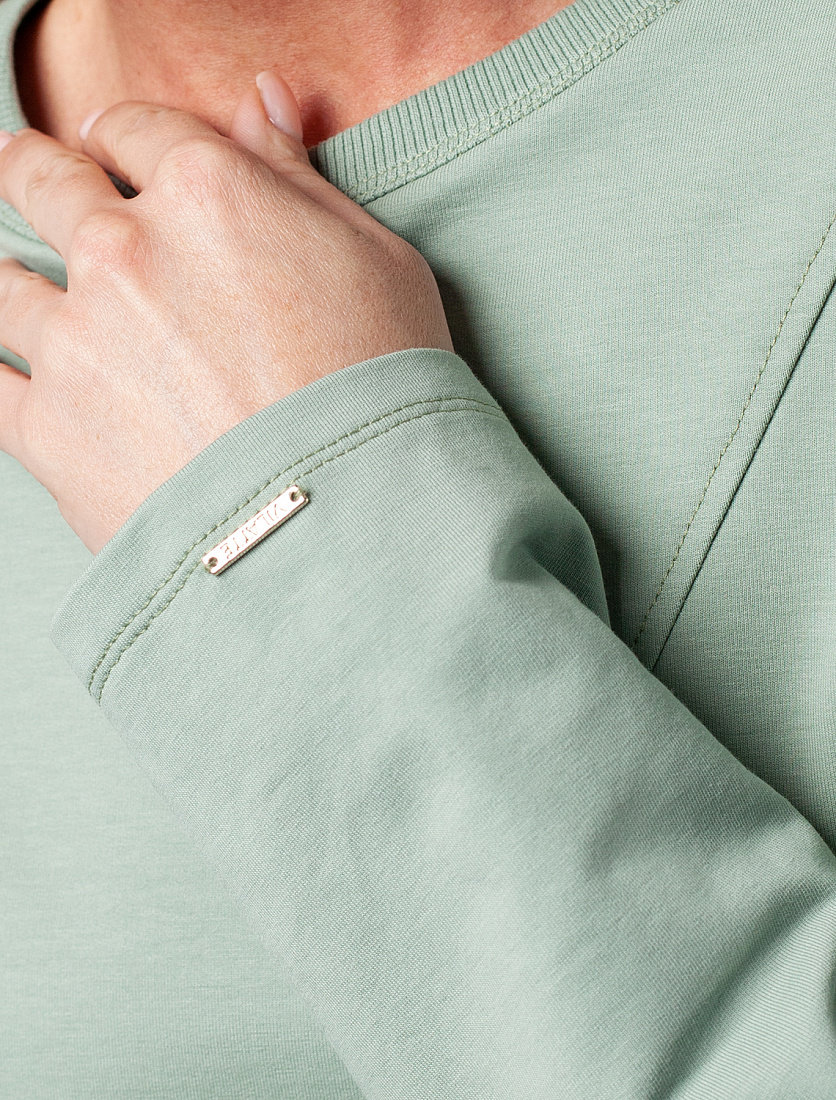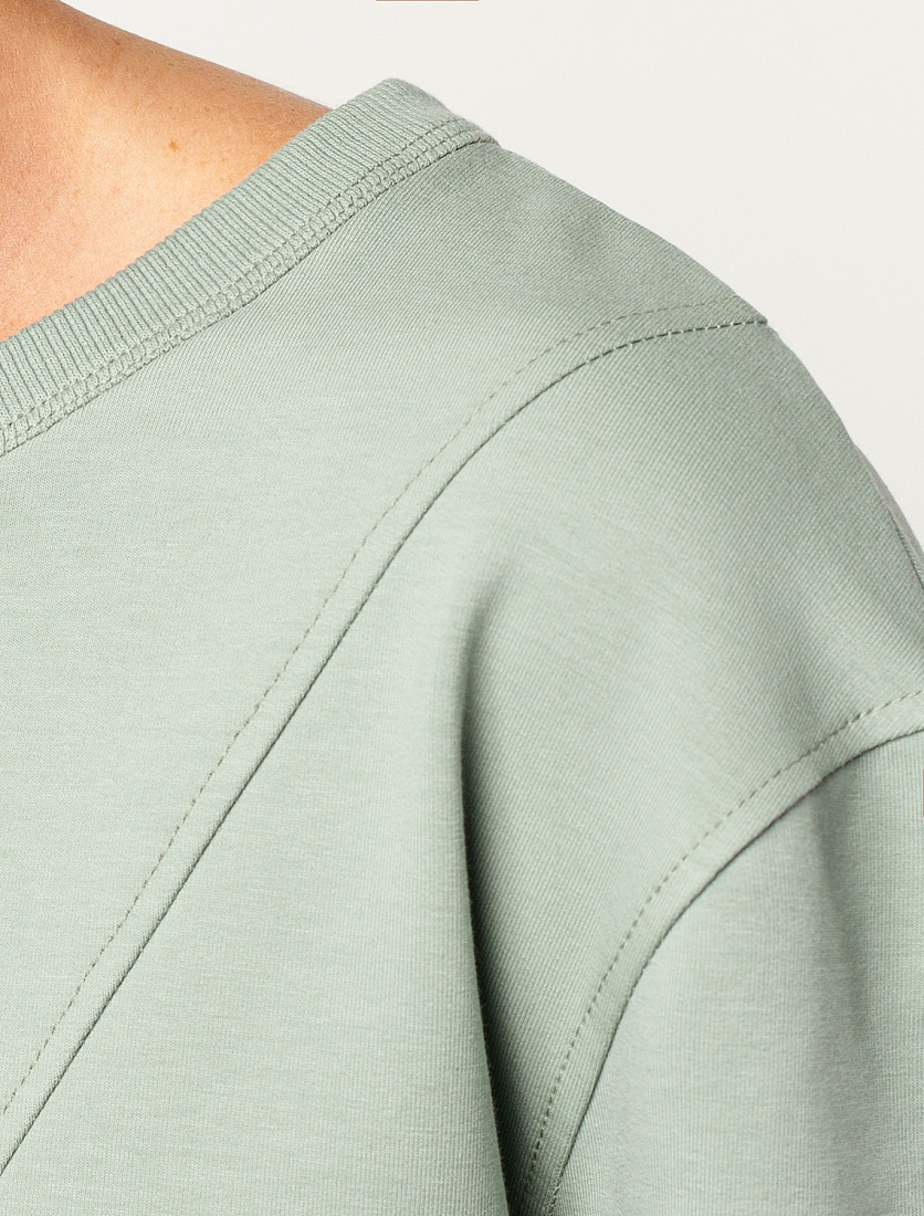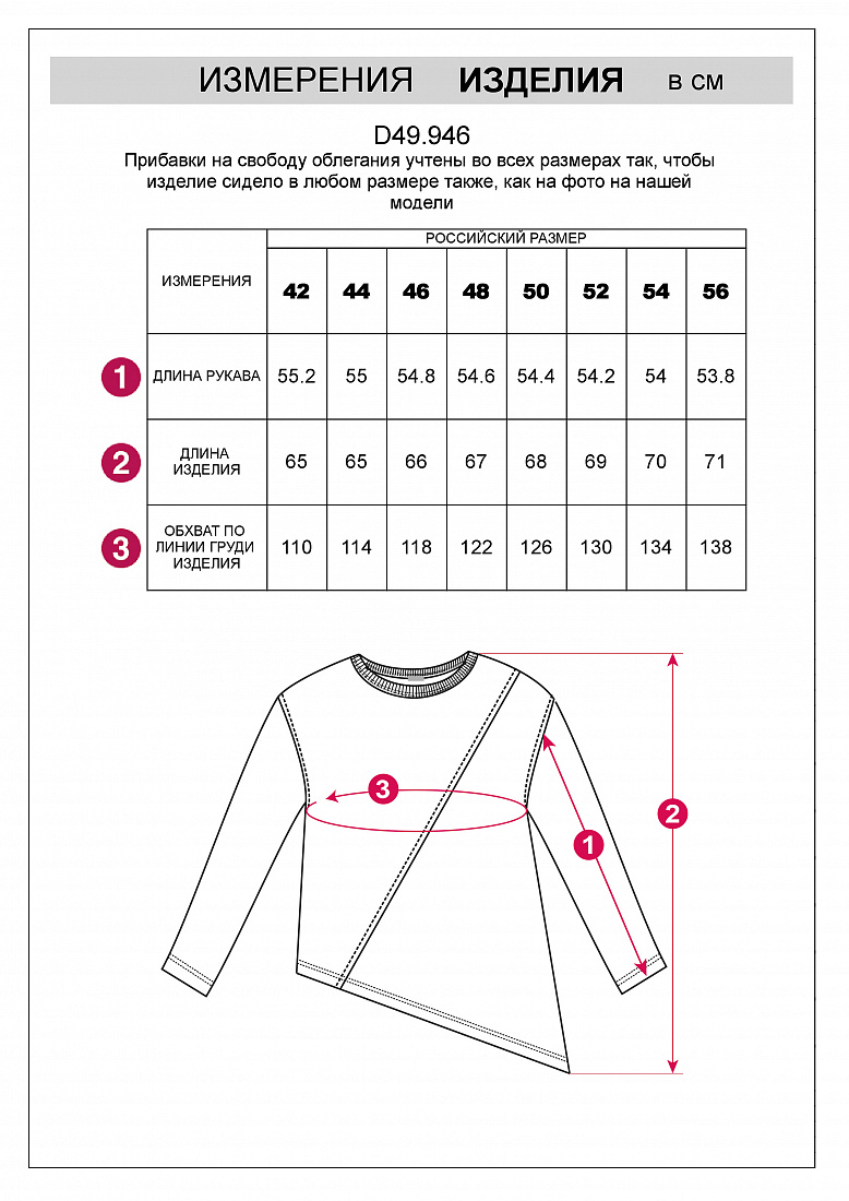 Ассиметричный джемпер выполнен из премиального футера двухнитки. Спущенная линия плеча поддерживает расслабленный образ, который особенно хорошо будет сочетаться в костюме с брюками D44.122, D44.123 и D44.128. Наличие эластана в составе изделия гарантирует идеальную посадку и комфорт.