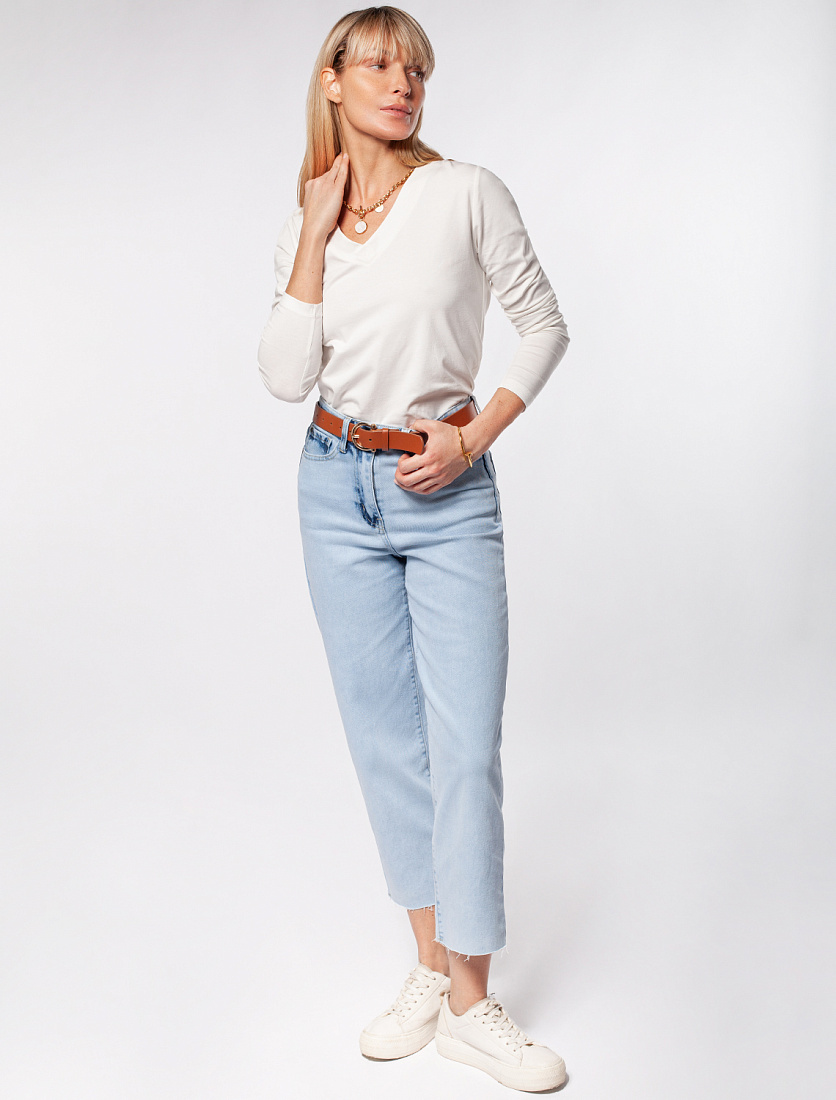 Белый джемпер с длинными рукавами и V-образным вырезом сшит из премиального хлопка. Однотонная хлопковая модель хорошо поддерживает комфортный для тела микроклимат. Благодаря вплетению эластановых волокон вещь хорошо сохраняет форму.