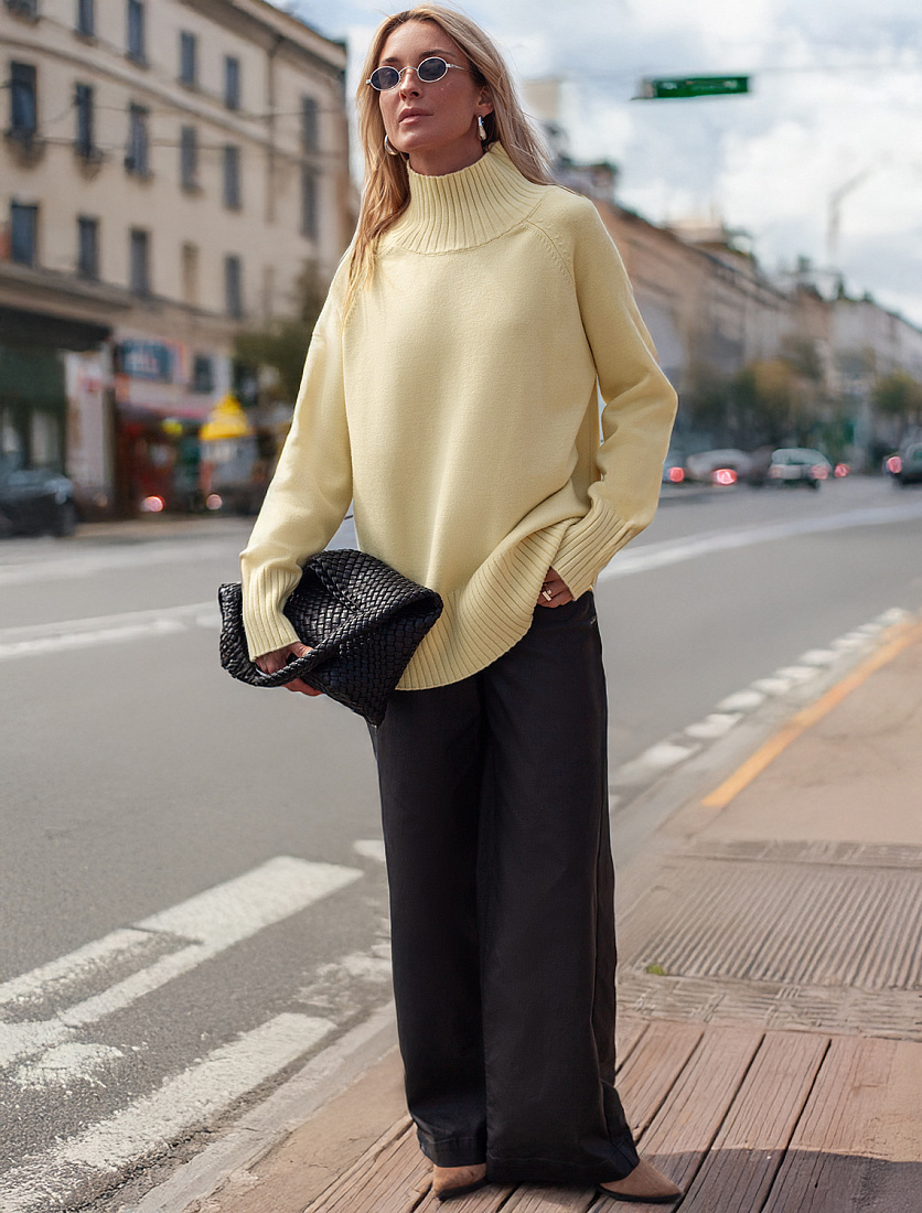 Джемпер с воротом стойка выполнен из мягкой пряжи с кашемиром. Модель свободного силуэта с рукавом реглан будет стильно сочетается с брюками и джинсами. Мягкая пряжа очень приятная к телу, поддержит комфорт на протяжении всего дня, при этом не перегревая. Сочетается в костюме с брюками D38.013, D38.012 и юбкой D36.016