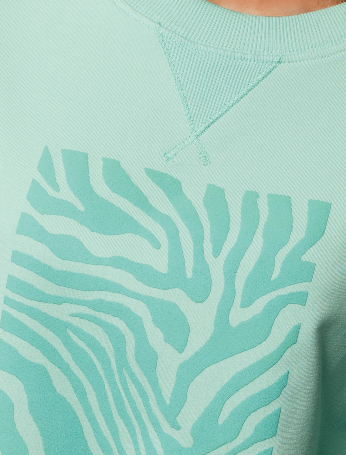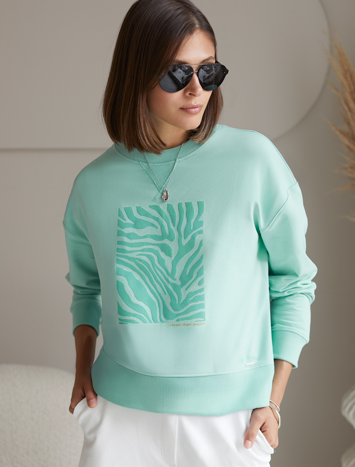 Перевод принта: Create, share, inspire - создавай, делись, вдохновляй. Джемпер среднего объема со спущенным плечом выполнен из футера двухнитки с эластаном. Принт нанесен фактурной краской. Эластичный материал гарантирует комфорт и формоустойчивость. Сочетается в костюме с брюками D44.138, D44.139 и шортами D48.008. Изделие дополнено металлическим логотипом бренда.