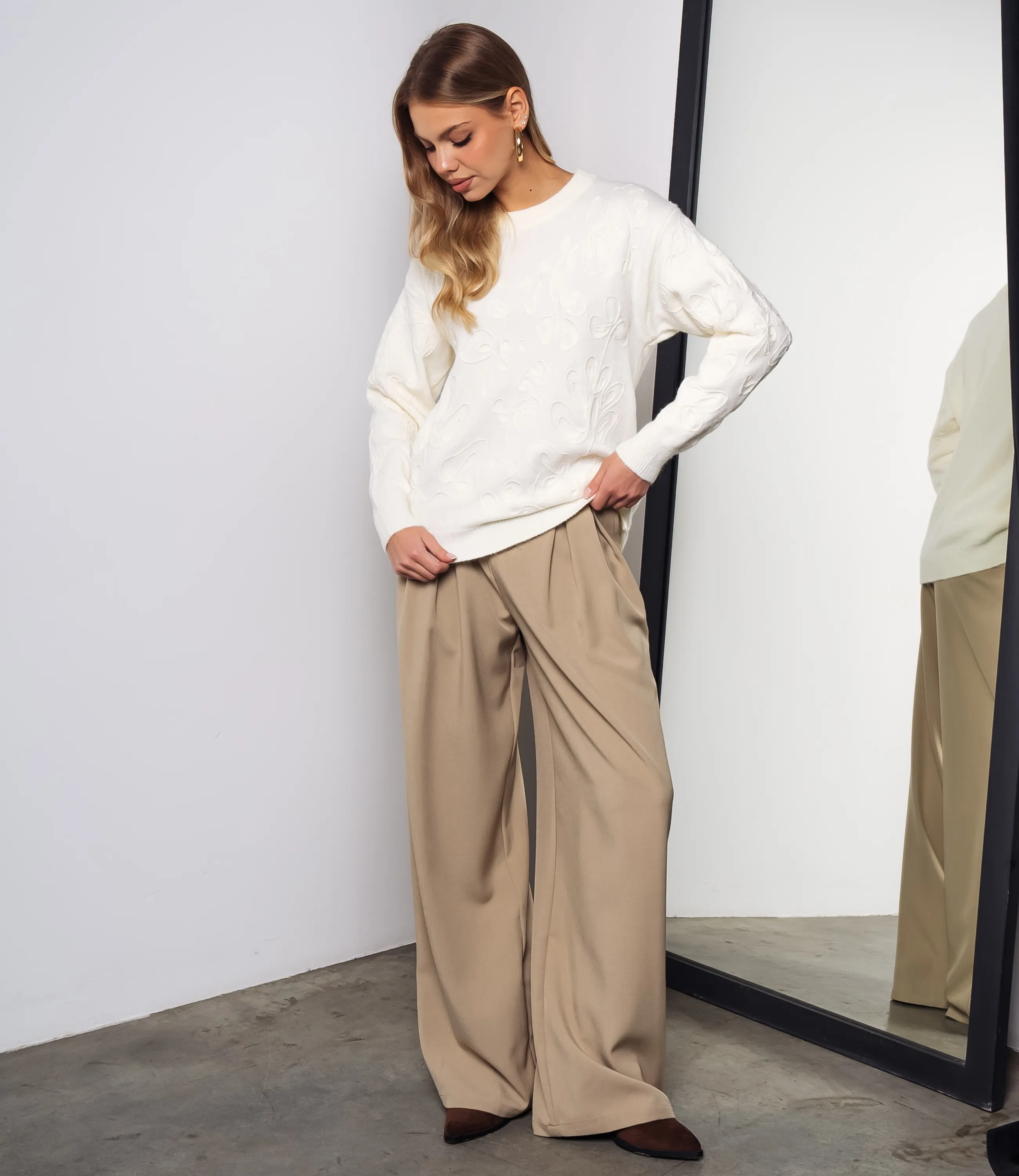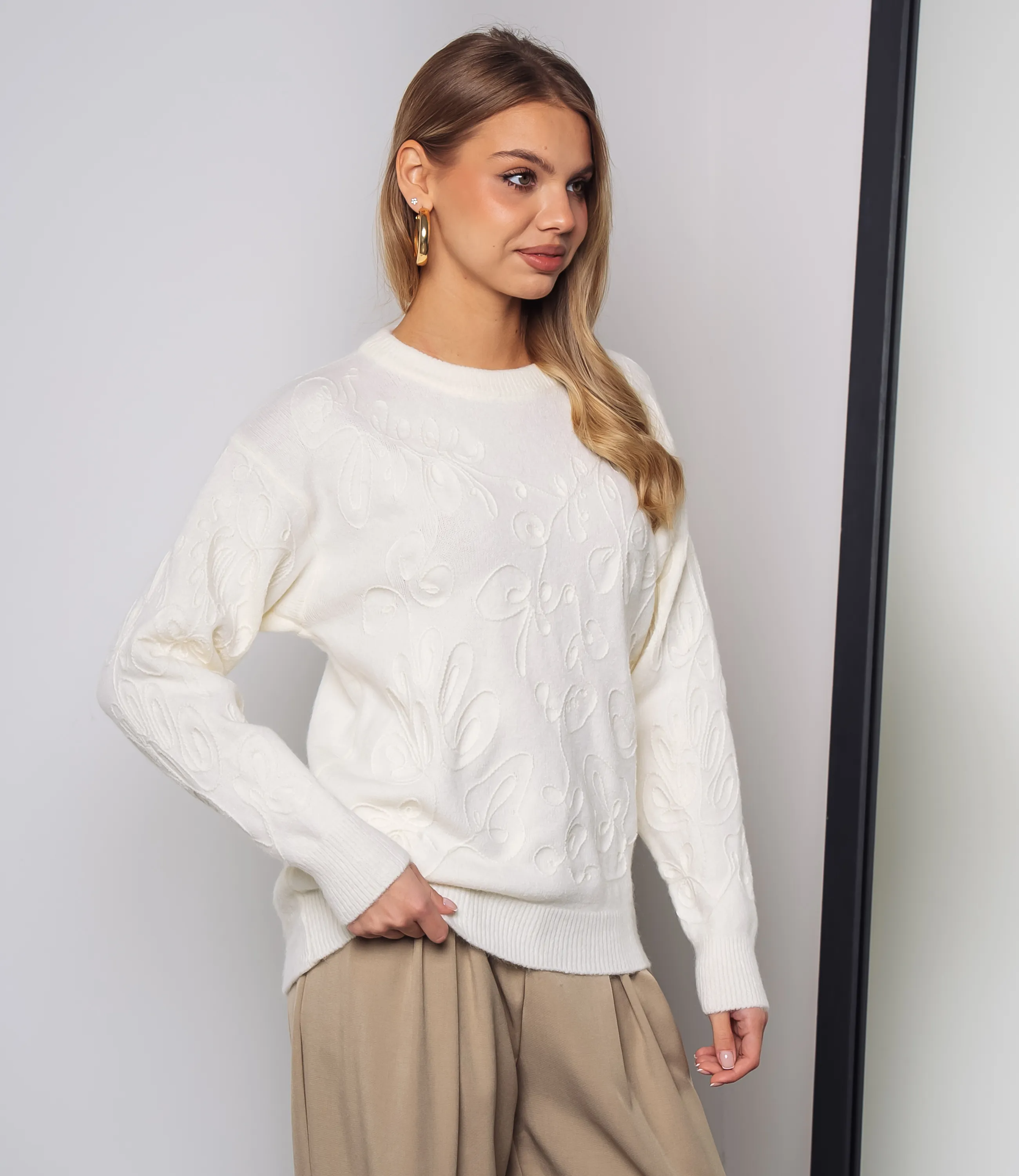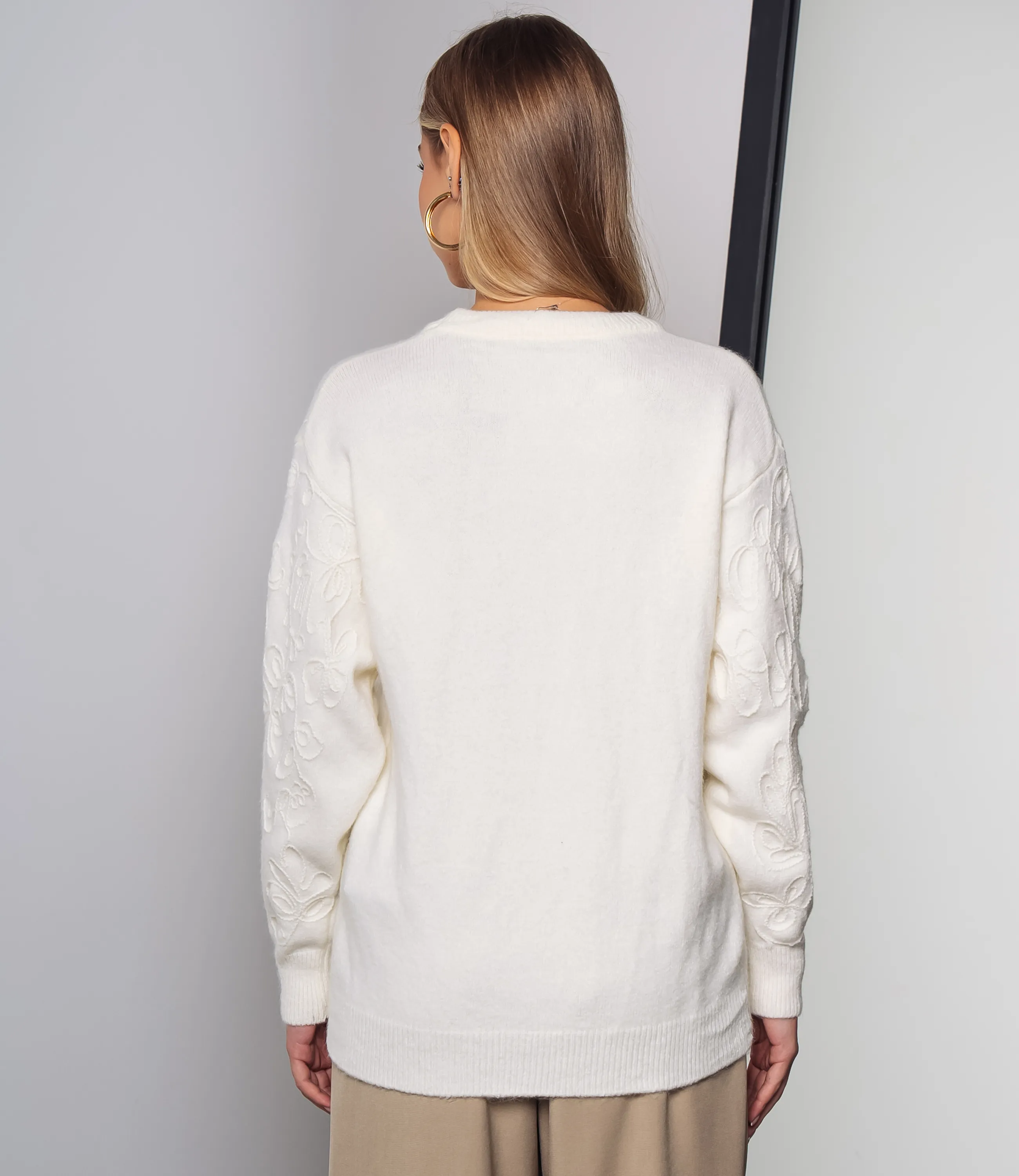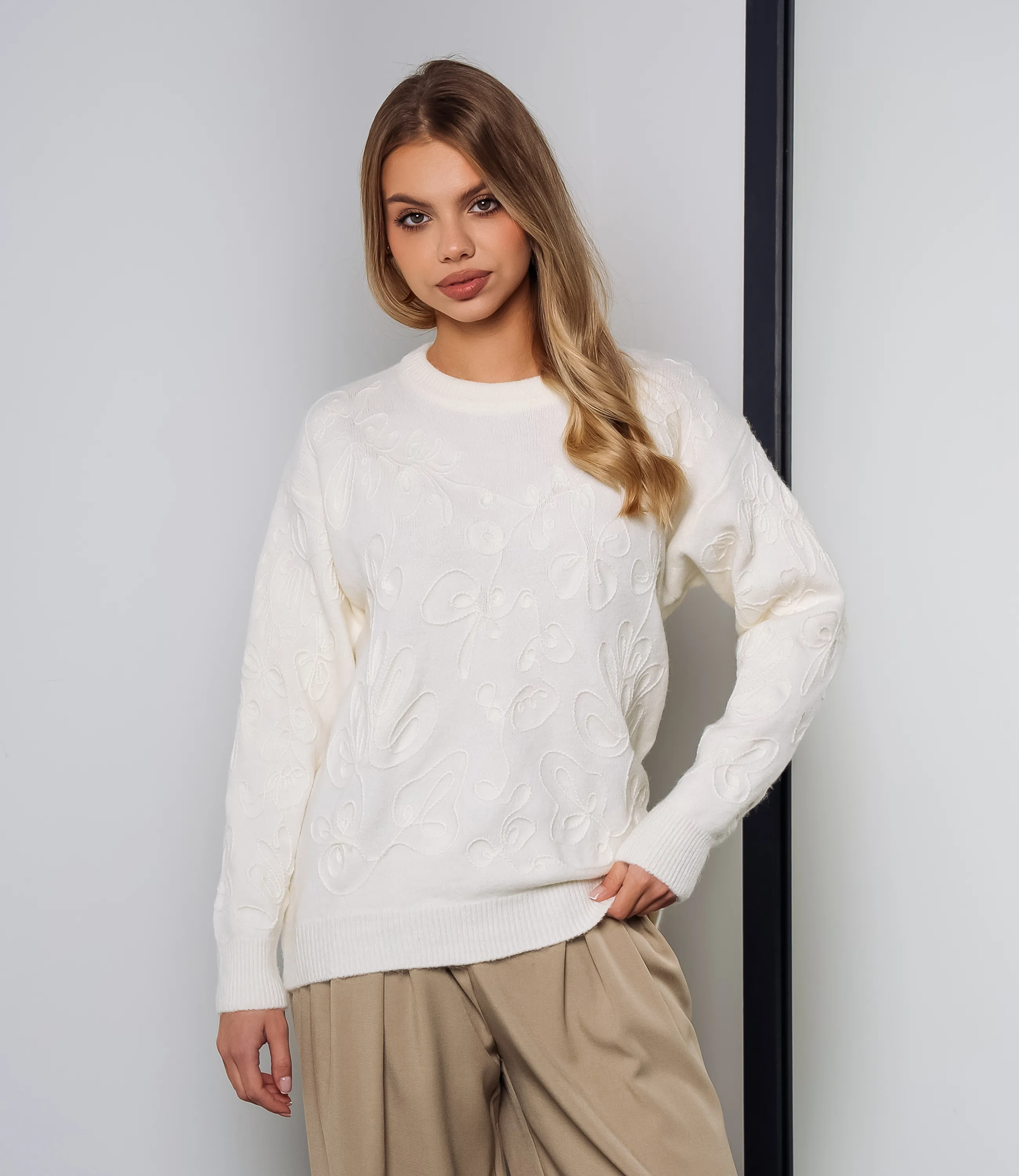 Джемпер — это универсальная часть гардероба, которая выделяет женственность и придает образу аккуратность и стиль. Джемпер выполнен из плотного трикотажного полотна средней фактуры с выраженной объемной вышивкой, создающей рельефный флористический узор по всей поверхности. Модель прямого, слегка расслабленного кроя с мягко опущенной линией плеч, обеспечивающей свободную посадку в области рукавов. Горловина выполнена в виде кругового невысокого выреза с плотной резинкой, аккуратно прилегающей к шее. Рукава длинные, немного расширенные к низу, с широкими манжетами в рубчик, которые придают завершенность силуэту и предотвращают растягивание. Низ изделия оформлен широкой резинкой в рубчик. Для пошива использована ткань: 55% акрил, 45% хлопок. Материал отличается приятной на ощупь структурой, эластичностью и хорошей износостойкостью; даже после многократных стирок изделие не утратит первоначального вида и посадки. Обратите внимание на насыщенные оттенки: цвет соответствует фотографии на сайте, что важно при формировании товарной витрины. На странице представлена таблица размеров, с помощью которой можно самостоятельно снять мерки и подобрать нужный размер. Мы предлагаем выгодные оптовые условия, гибкую ценовую политику и стабильные поставки, что позволит вам формировать привлекательную наценку и обеспечивать высокую оборотность. Цена установлена адекватная, а качество — стабильное: предложите своим клиенткам джемпер, сочетающий комфорт, стиль и надежность. Рост модели 168 см., 89-63-90.