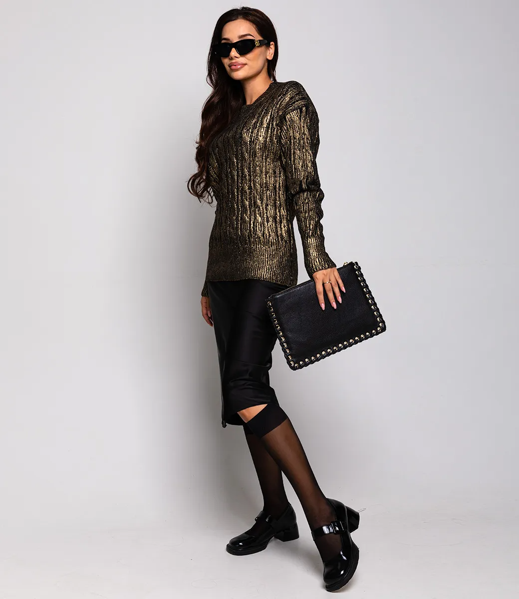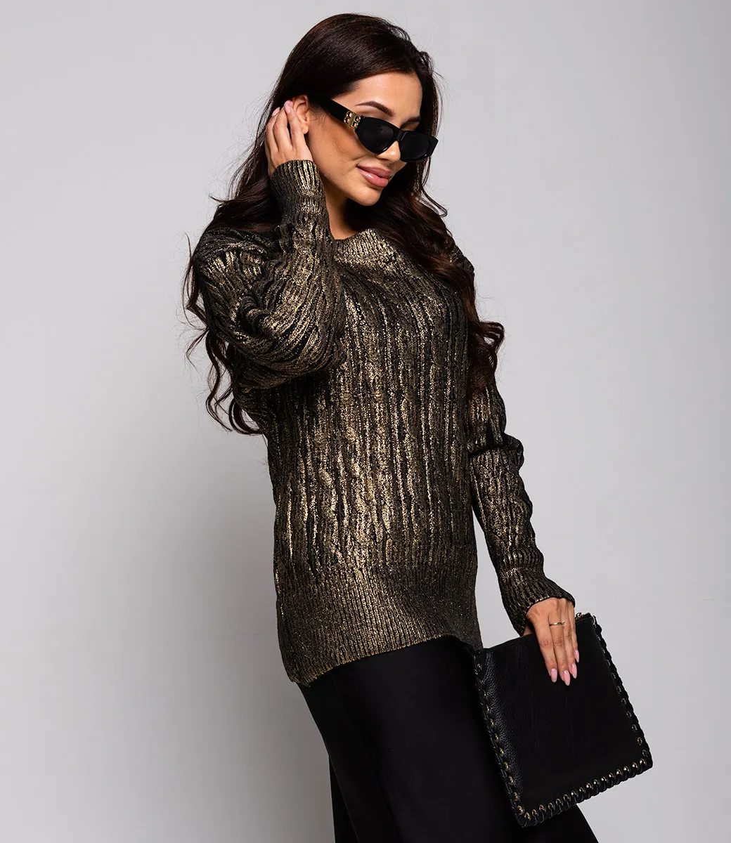 Яркий вязанный джемпер в металлизированном стиле будет ярким и теплым дополнением к образу.