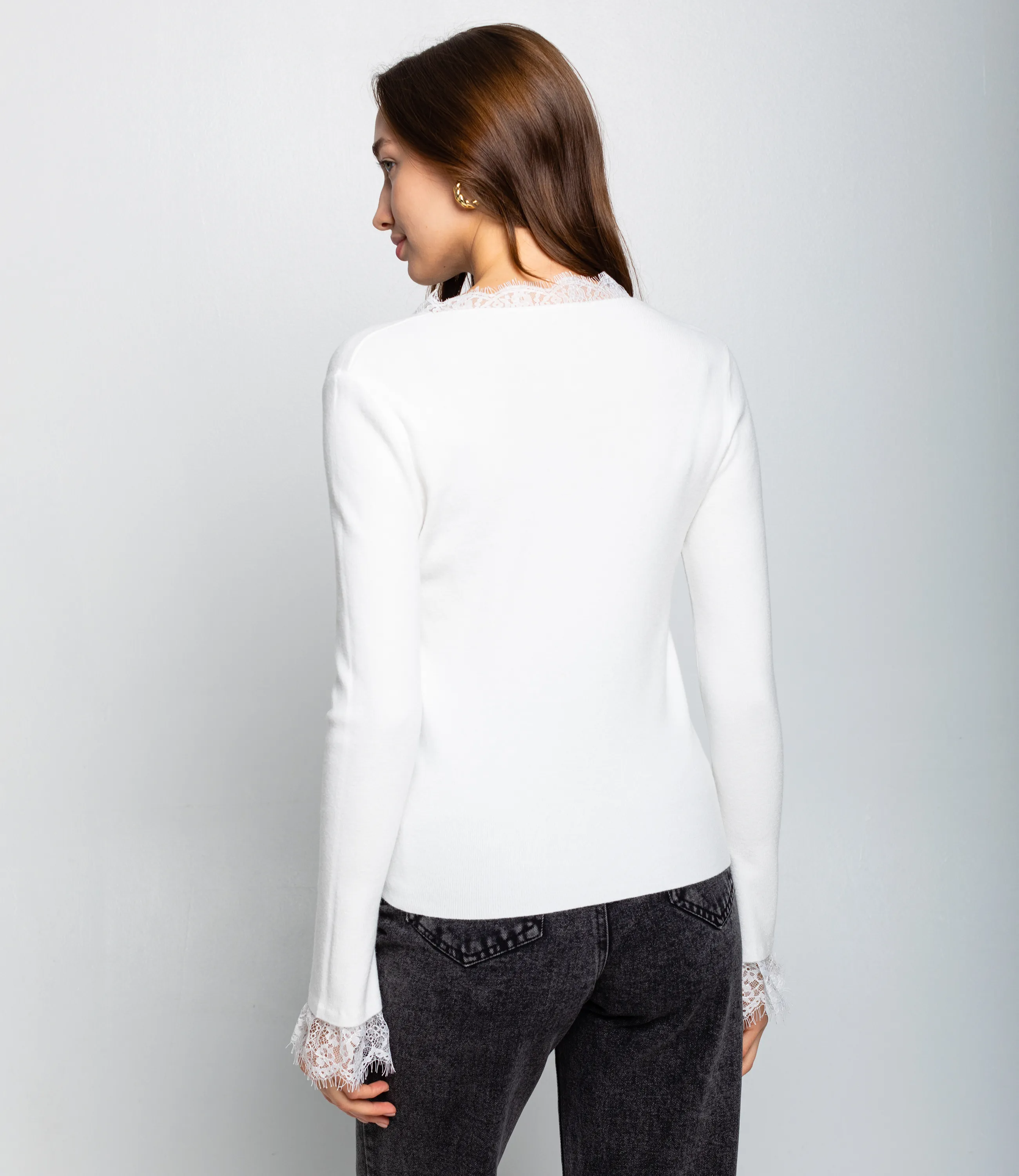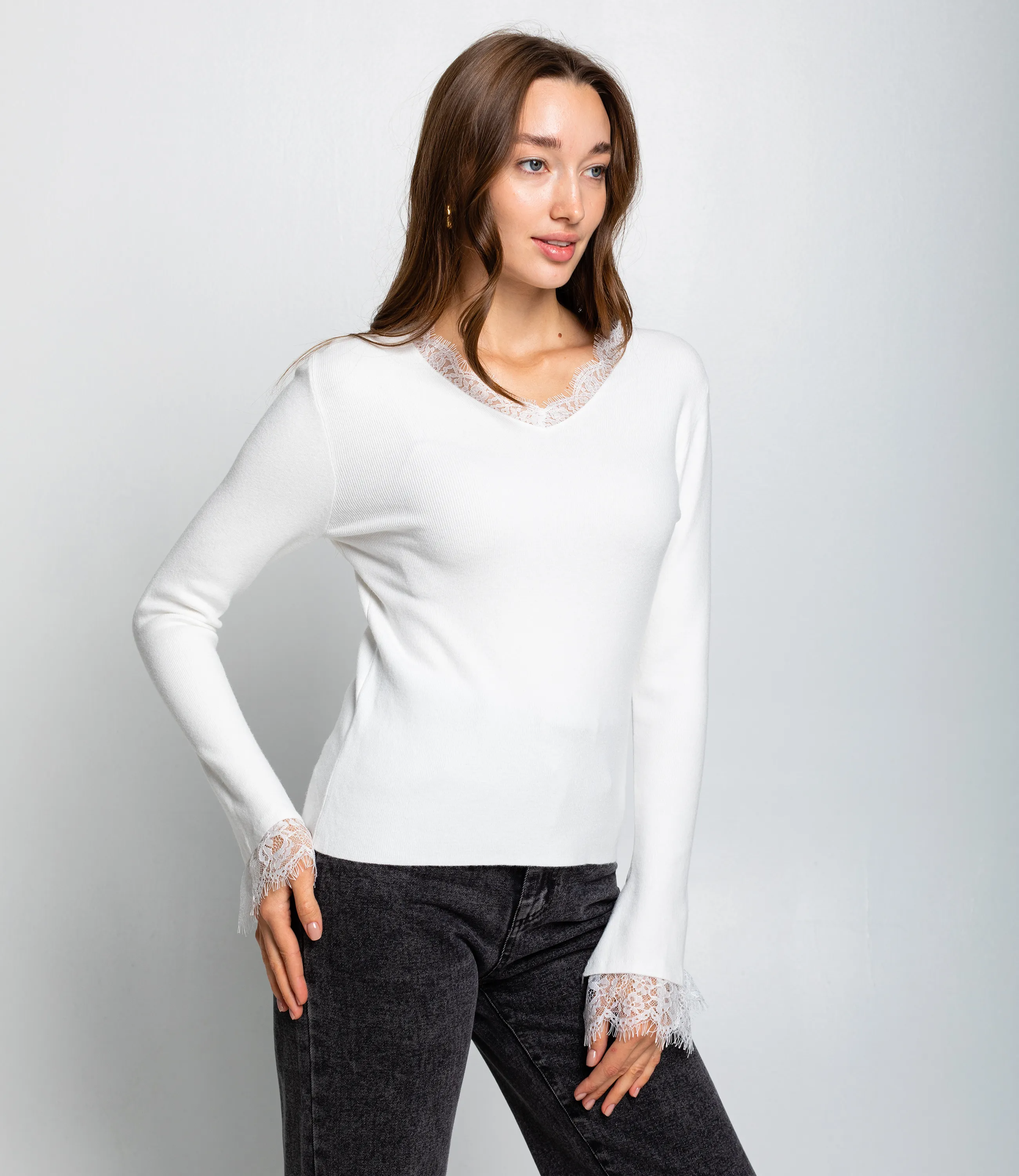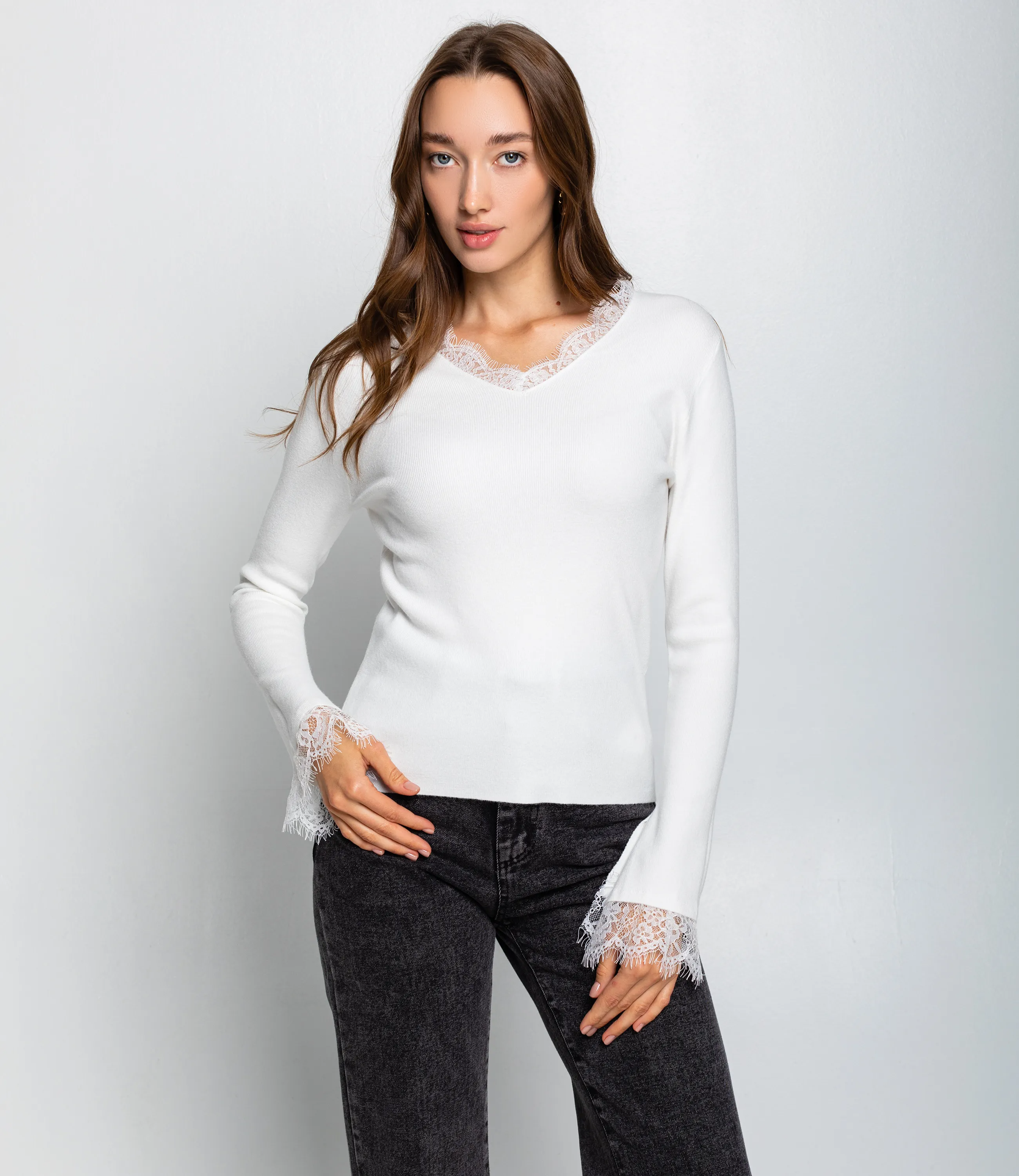 Джемпер — это часть гардероба, которая подчёркивает женственность и утончённость каждой покупательницы. Модель выполнена из тонкого вязаного полотна плотно прилегающего силуэта с длинными рукавами и V‑образным вырезом, украшенным аккуратной отделкой из тонкого кружева. Такая же кружевная отделка присутствует на манжетах, добавляя изделию изящные детали. Простой лаконичный крой без лишних декоров делает джемпер универсальным: он идеально смотрится как сам по себе в более элегантных образах, так и в многослойных повседневных сочетаниях. Для пошива использована ткань 65% хлопок, 30% полиэстер, 5% эластан. Хлопок обеспечивает мягкость и комфорт при носке, полиэстер добавляет прочности, стойкости цвета и минимизирует усадку, а эластан — сохраняет идеальную посадку и форму изделия. Тонкий трикотаж приятен на ощупь, легко драпируется и отлично подходит для сочетания с жакетами, плащами и пальто. Для оптовых покупателей джемпер представляет собой выгодную позицию: лаконичная базовая модель с декоративной деталью, которая быстро продаётся в сегментах casual и smart casual. Универсальная посадка и эластичная ткань упрощают формирование размерного ряда и сокращают количество возвратов. Плотный состав и аккуратная отделка снижают процент рекламаций и повышают лояльность клиентов. Цвета насыщенные и соответствуют фото в карточке товара, на странице размещена подробная таблица размеров для точного подбора. Рост модели: 168, параметры: 85-63-92.