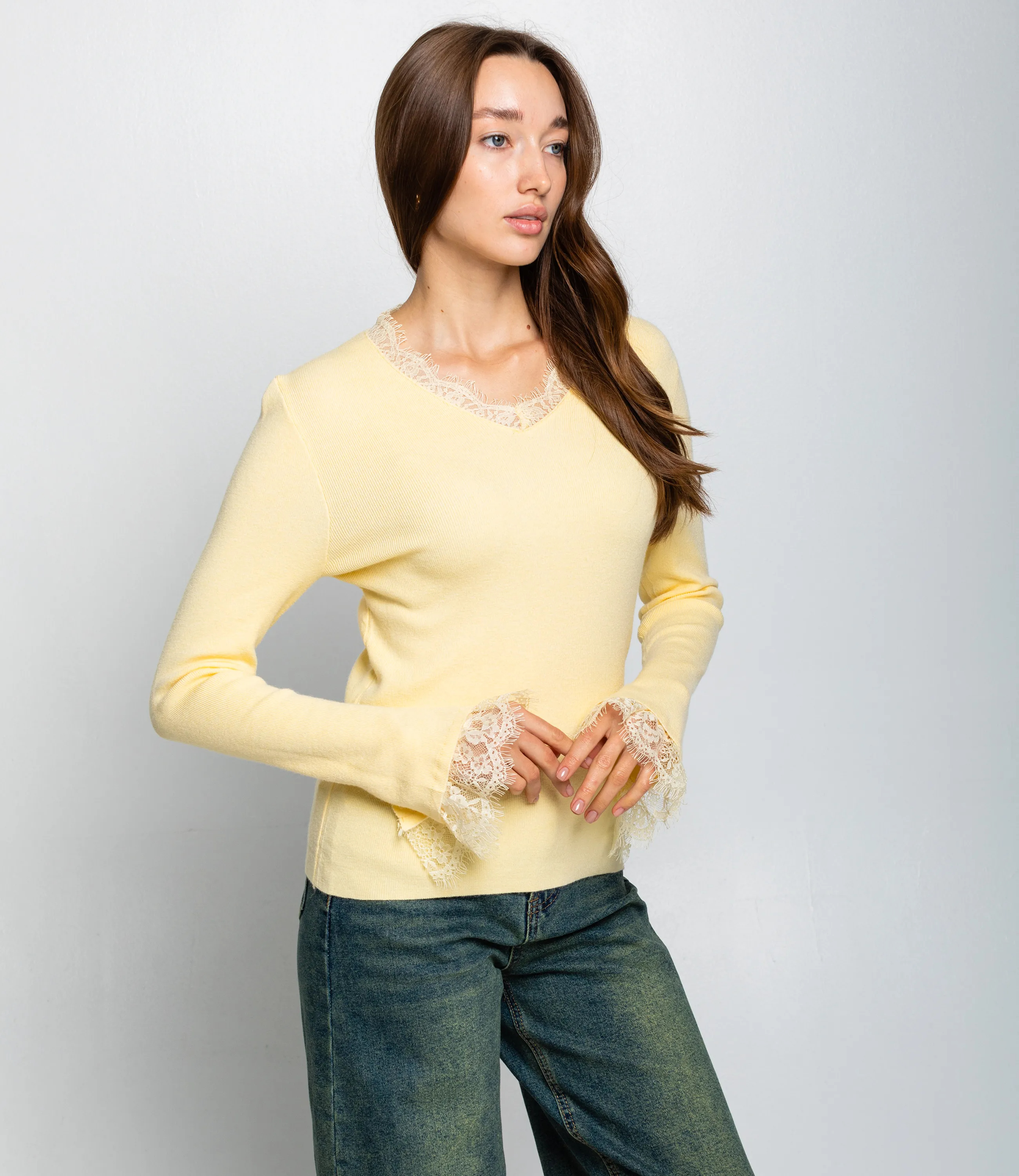Джемпер — это часть гардероба, которая подчёркивает женственность и утончённость каждой покупательницы. Модель выполнена из тонкого вязаного полотна плотно прилегающего силуэта с длинными рукавами и V‑образным вырезом, украшенным аккуратной отделкой из тонкого кружева. Такая же кружевная отделка присутствует на манжетах, добавляя изделию изящные детали. Простой лаконичный крой без лишних декоров делает джемпер универсальным: он идеально смотрится как сам по себе в более элегантных образах, так и в многослойных повседневных сочетаниях. Для пошива использована ткань 65% хлопок, 30% полиэстер, 5% эластан. Хлопок обеспечивает мягкость и комфорт при носке, полиэстер добавляет прочности, стойкости цвета и минимизирует усадку, а эластан — сохраняет идеальную посадку и форму изделия. Тонкий трикотаж приятен на ощупь, легко драпируется и отлично подходит для сочетания с жакетами, плащами и пальто. Для оптовых покупателей джемпер представляет собой выгодную позицию: лаконичная базовая модель с декоративной деталью, которая быстро продаётся в сегментах casual и smart casual. Универсальная посадка и эластичная ткань упрощают формирование размерного ряда и сокращают количество возвратов. Плотный состав и аккуратная отделка снижают процент рекламаций и повышают лояльность клиентов. Цвета насыщенные и соответствуют фото в карточке товара, на странице размещена подробная таблица размеров для точного подбора. Рост модели: 168, параметры: 85-63-92.