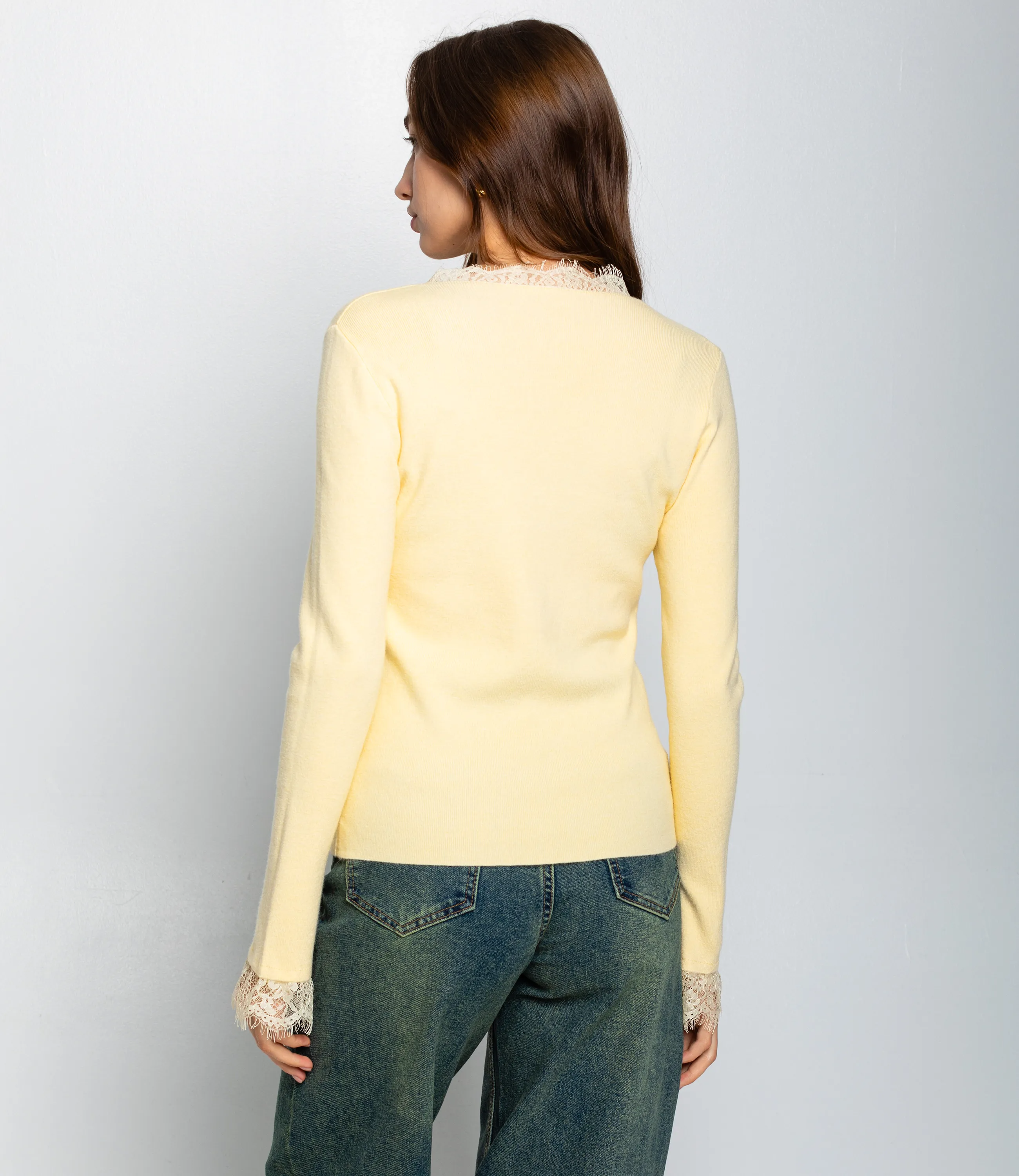 Джемпер — это часть гардероба, которая подчёркивает женственность и утончённость каждой покупательницы. Модель выполнена из тонкого вязаного полотна плотно прилегающего силуэта с длинными рукавами и V‑образным вырезом, украшенным аккуратной отделкой из тонкого кружева. Такая же кружевная отделка присутствует на манжетах, добавляя изделию изящные детали. Простой лаконичный крой без лишних декоров делает джемпер универсальным: он идеально смотрится как сам по себе в более элегантных образах, так и в многослойных повседневных сочетаниях. Для пошива использована ткань 65% хлопок, 30% полиэстер, 5% эластан. Хлопок обеспечивает мягкость и комфорт при носке, полиэстер добавляет прочности, стойкости цвета и минимизирует усадку, а эластан — сохраняет идеальную посадку и форму изделия. Тонкий трикотаж приятен на ощупь, легко драпируется и отлично подходит для сочетания с жакетами, плащами и пальто. Для оптовых покупателей джемпер представляет собой выгодную позицию: лаконичная базовая модель с декоративной деталью, которая быстро продаётся в сегментах casual и smart casual. Универсальная посадка и эластичная ткань упрощают формирование размерного ряда и сокращают количество возвратов. Плотный состав и аккуратная отделка снижают процент рекламаций и повышают лояльность клиентов. Цвета насыщенные и соответствуют фото в карточке товара, на странице размещена подробная таблица размеров для точного подбора. Рост модели: 168, параметры: 85-63-92.