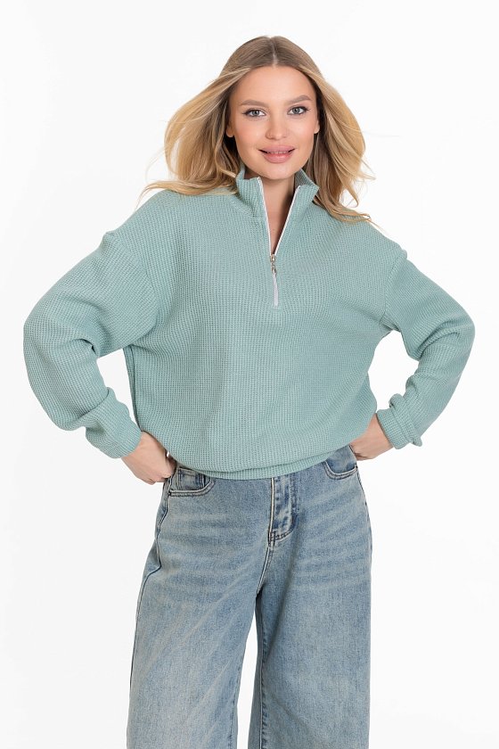 Женский джемпер выполнен из мягкого и тёплого вязаного полотна цвета ментол. Эта модель имеет спущенную линию плеча, что придаёт изделию оригинальность и свободу движений. Воротник-стойка с застёжкой на молнию обеспечивает дополнительный комфорт, а резинка по низу джемпера гарантирует удобную посадку и сохраняет тепло. Такой джемпер станет стильным элементом вашего гардероба и подойдёт для создания разнообразных образов.