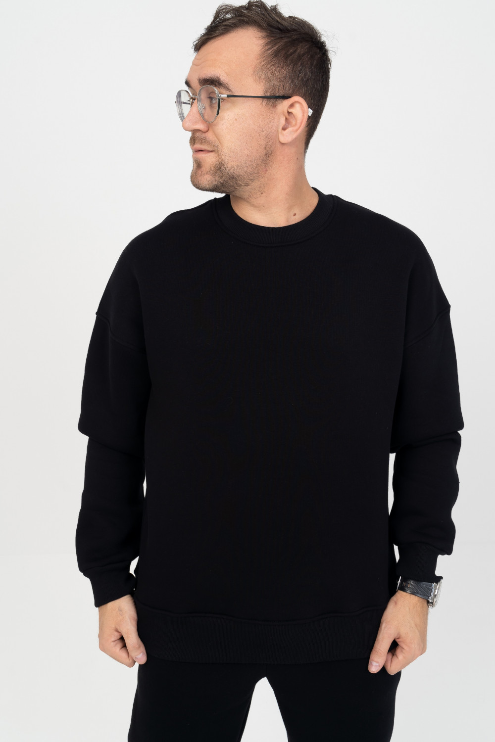 Мужской свитшот из мягкого хлопкового футера с начёсом свободного силуэта. Горловина круглой формы с планкой из контрастного трикотажа как на свитере. Плечо спущенное с объемными рукавами на манжете. Все эти детали делают эту модель особенной привлекательной, выглядит очень эффектно и стильно.