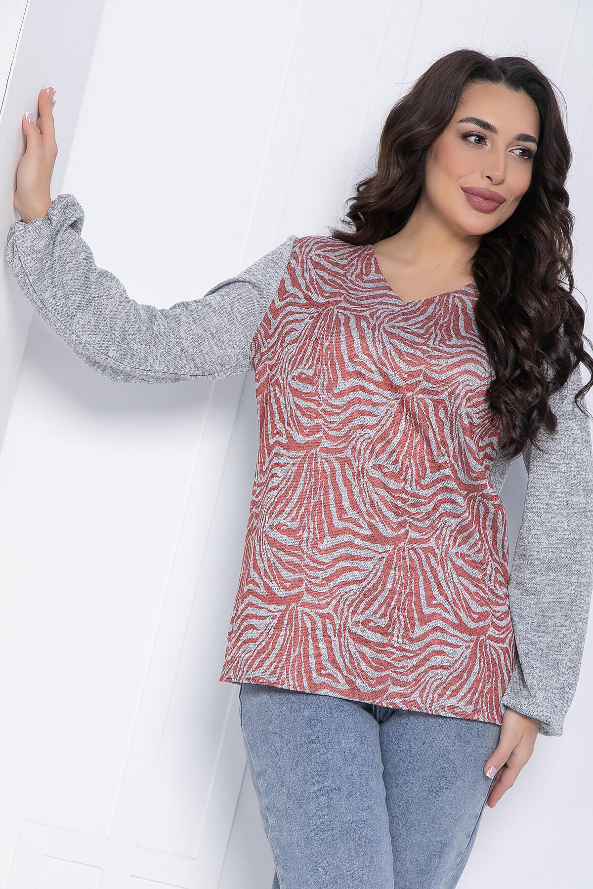 Вот он — прекрасный джемпер с принтом «зебра»! Этот комфортный и универсальный предмет гардероба станет отличным дополнением к вашему повседневному образу. Джемпер выполнен с V-образной горловиной, что придаёт ему особый шарм. Рукава оканчиваются резинкой, что обеспечивает удобство в носке. Спинка и рукава выполнены в однотонном сером цвете, создавая яркий контраст с выразительным принтом «зебра» на передней части джемпера.