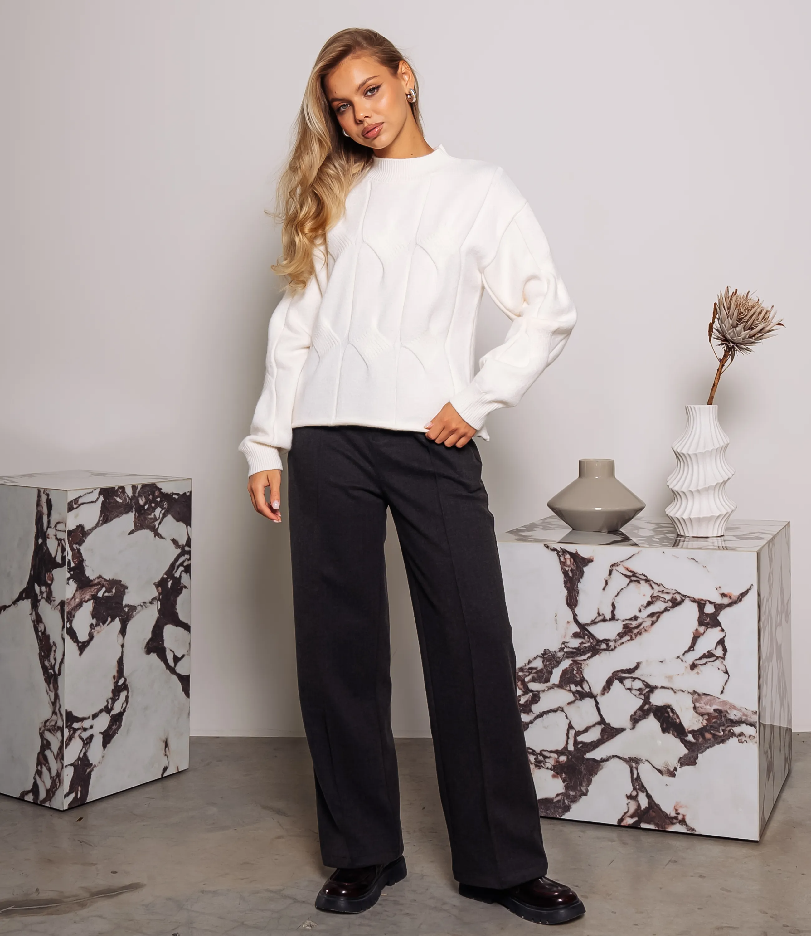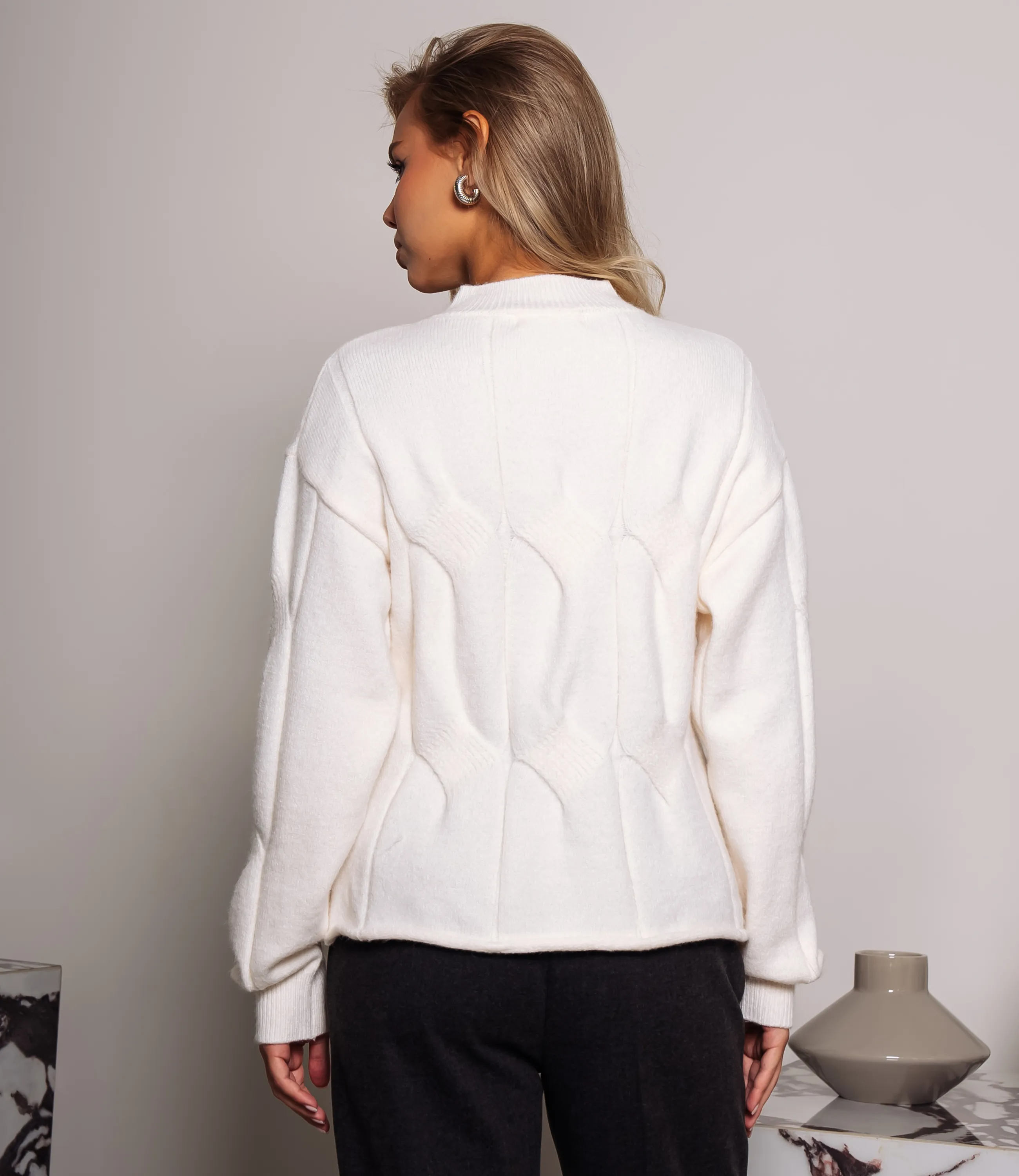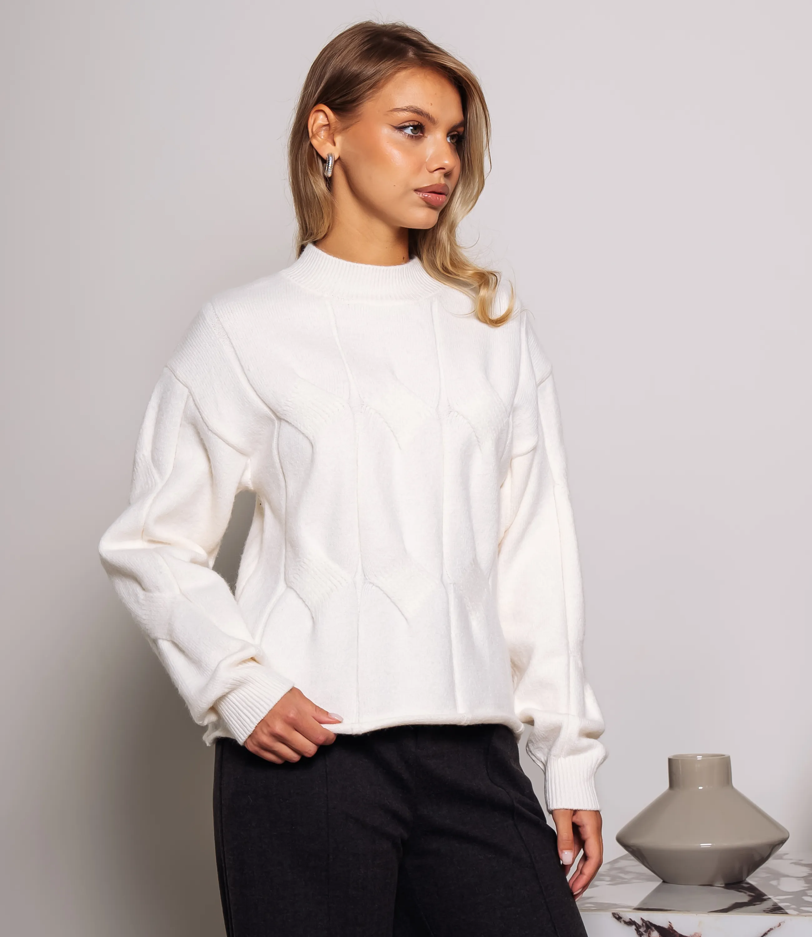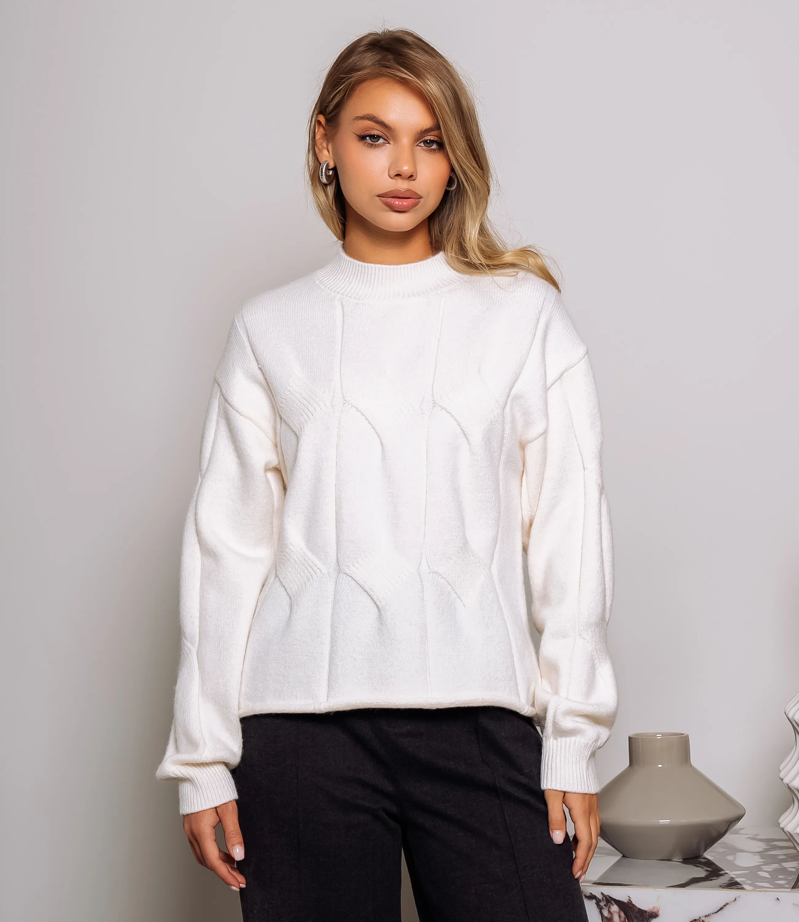 Джемпер — это элегантный и стильный элемент гардероба, который подчеркивает уникальность каждой женщины. Джемпер свободного прямого кроя из мягкой вязаной ткани с выраженной фактурой. Горловина выполнена в виде узкой стойки с плотной резинкой, переходящей в аккуратную окантовку. Плечи слегка опущены, рукава длинные, с умеренным объёмом по всей длине и собраны в манжеты резинкой, что создаёт лёгкую драпировку в области предплечий. По передней панели проходит геометрический рельефный узор в виде вертикально-изогнутых панелей, образующих тонкие контрастные швы и слегка выступающие рельефы. Состав ткани — 70% акрил, 20% полиэстер и 10% шерсть. Для удобства покупателей на странице доступна таблица размеров, что поможет им легко найти идеальный размер. Предложенная цена является доступной, а значит, ваши клиентки смогут с легкостью добавить этот стильный элемент в свой гардероб. Не упустите шанс предложить своим покупателям этот превосходный джемпер, который позволят им чувствовать себя уверенно и элегантно в любой обстановке! Подарите вашим клиентам возможность выделиться и продемонстрировать свой уникальный стиль с этим удивительным изделием! Рост модели 168, 89-63-90.