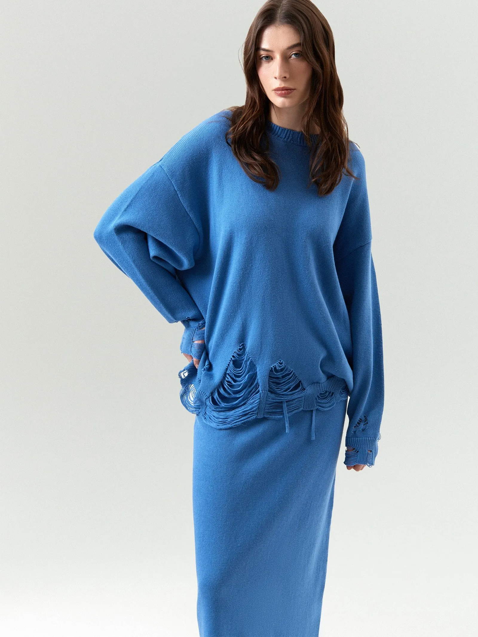 Джемпер oversize с рваным эффектом для гранжевых образов. Комфортный материал полностью из хлопка: такая вещь хорошо подойдёт на демисезон и прохладное лето. С юбкой можно создавать эклектичные стилизации, которые сейчас очень актуальны.