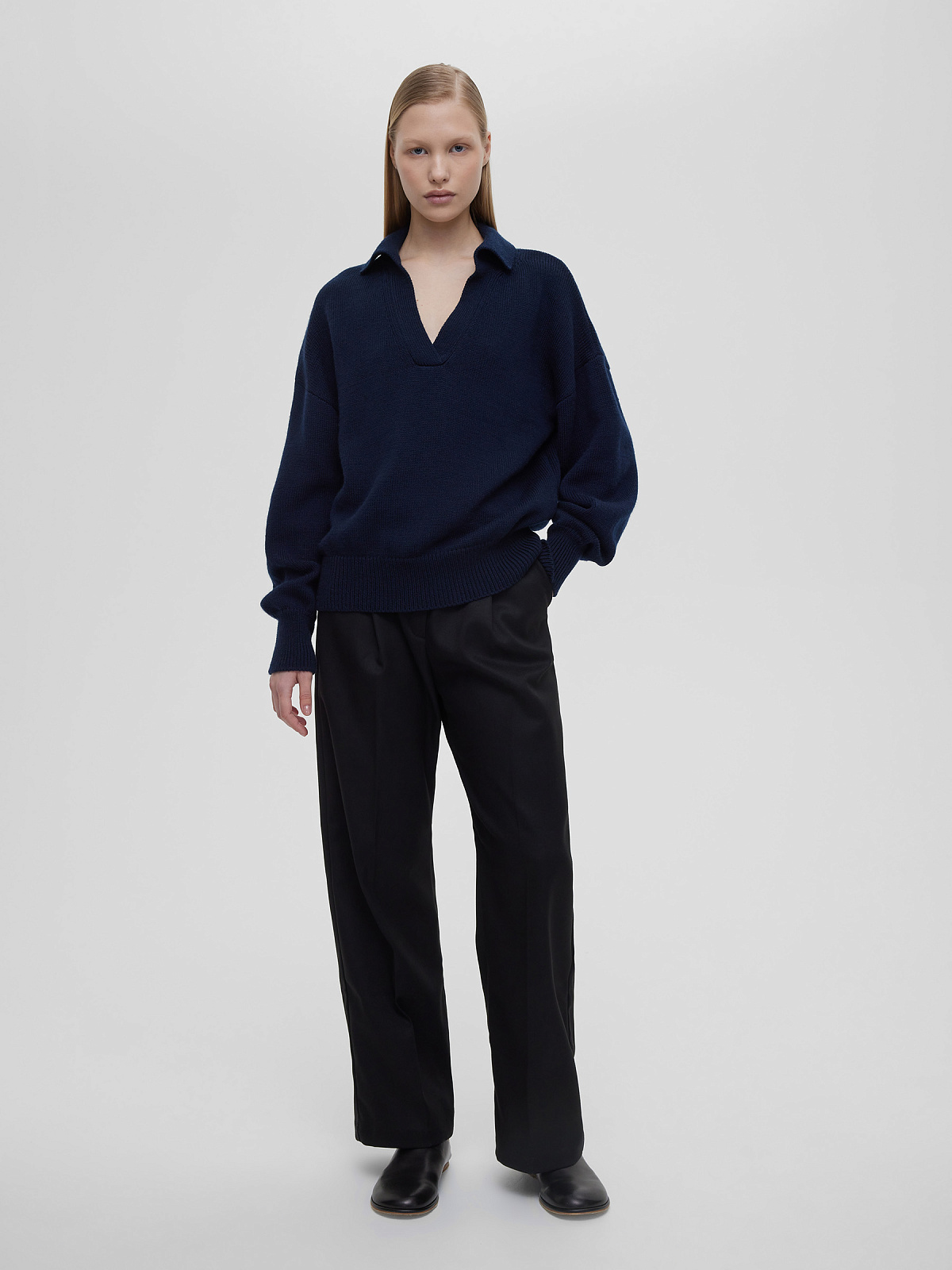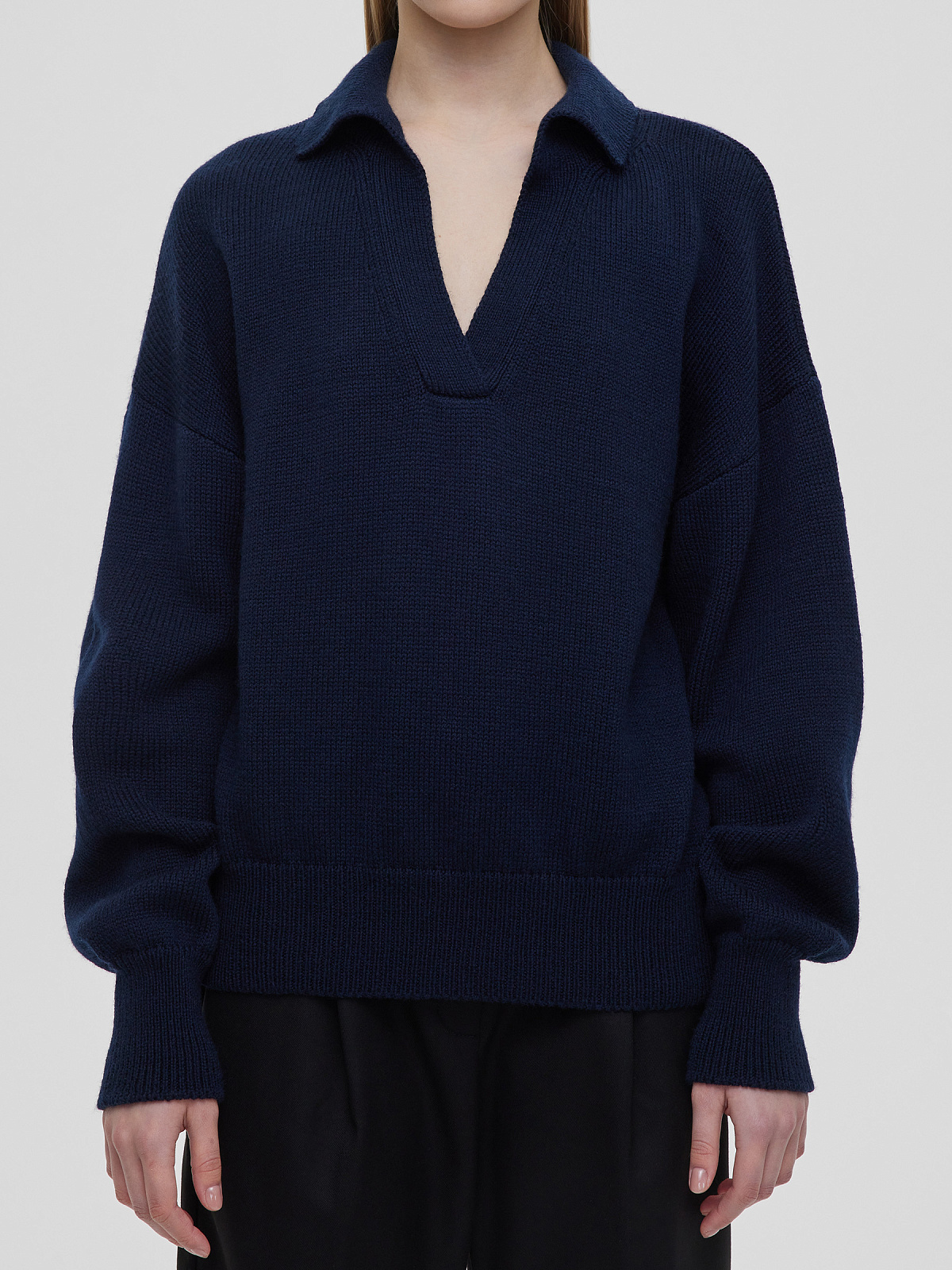 Джемпер-поло свободного кроя с отложным воротником — одна из ключевых моделей Aim Clo, к которой наши клиенты возвращаются из сезона в сезон. Спущенная линия плеча и V-образный вырез формируют мягкий, открытый силуэт и сохраняют ощущение свободы в движении.