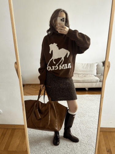 Изделия изготавливаются на нашей фабрике в России. Процесс вязки происходит на японской плосковязальной машине Shima Seiki. Все элементы изделия соединены вручную на кеттельном оборудовании. Перед отправкой каждое изделие тщательно стирается, и проводится дополнительный контроль качества.