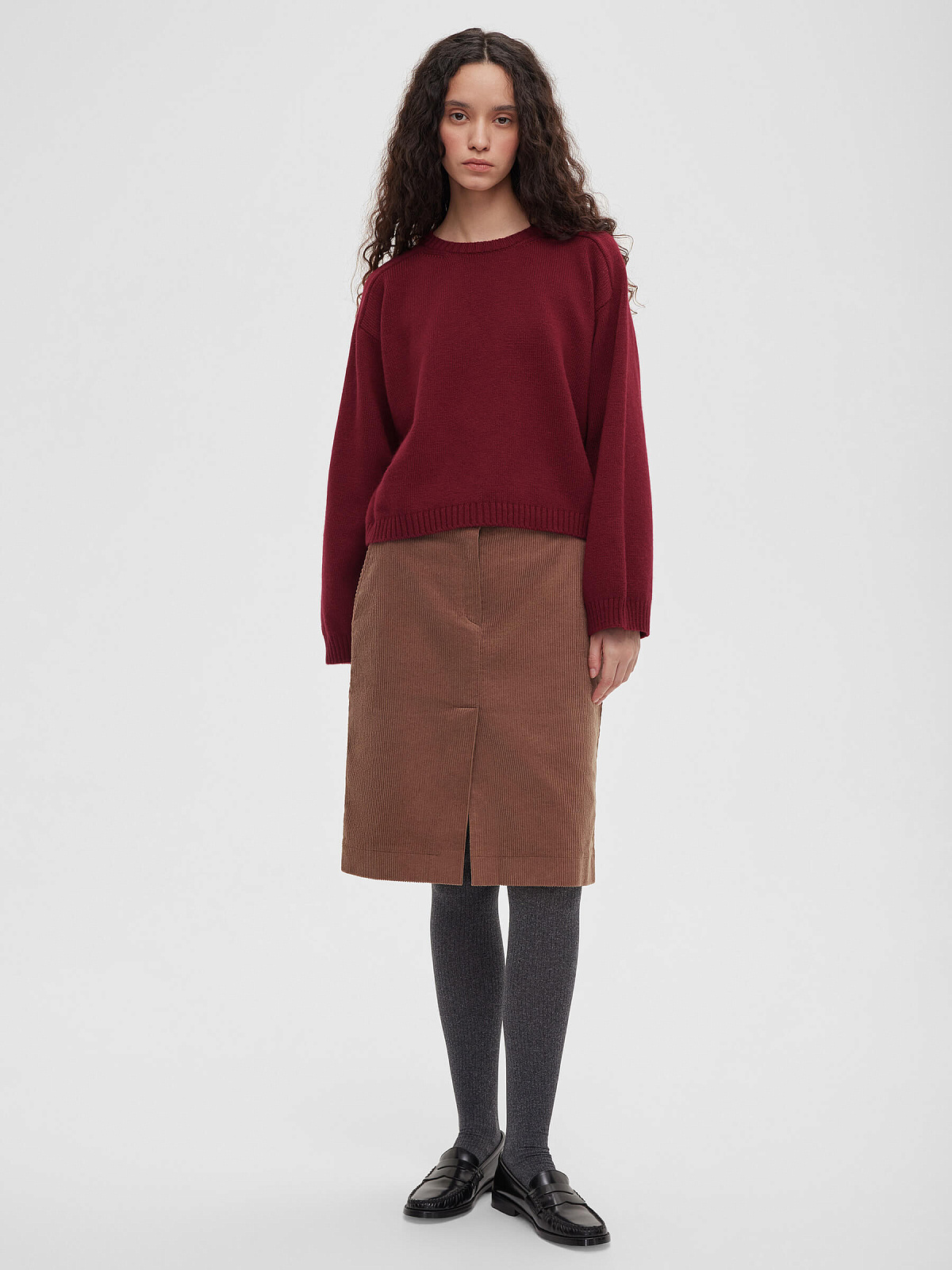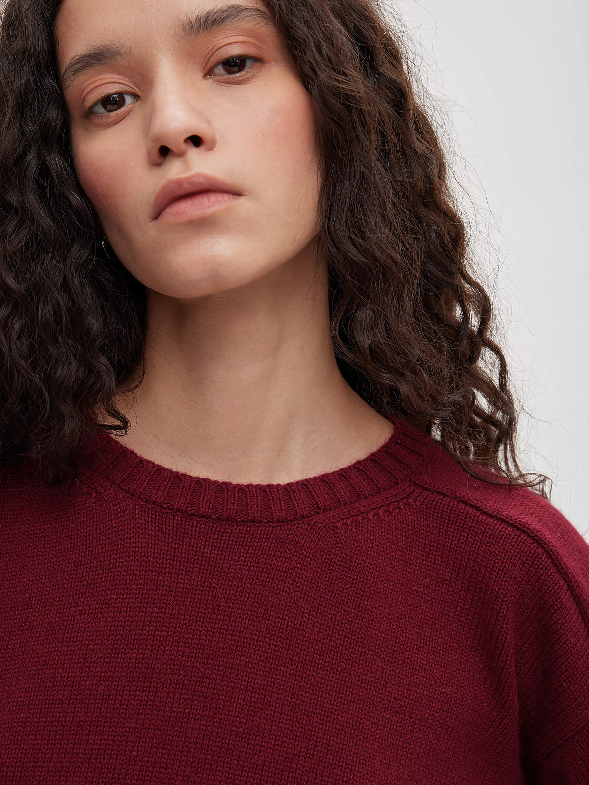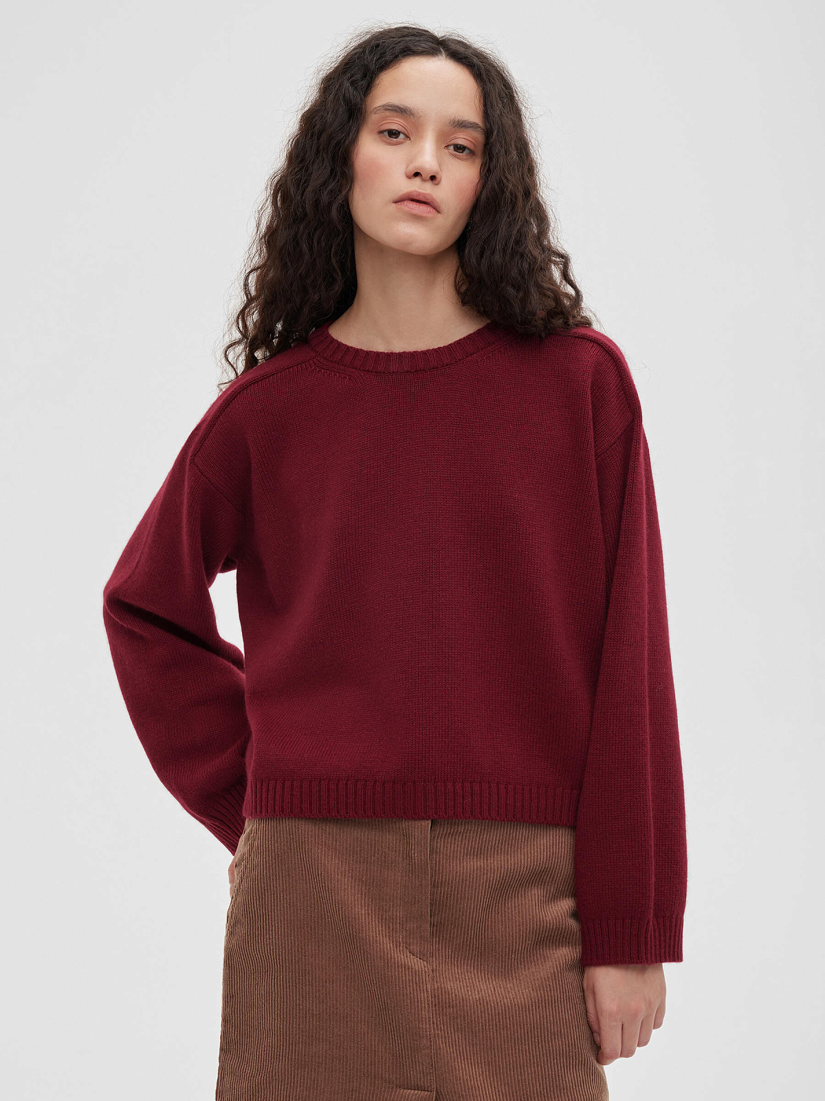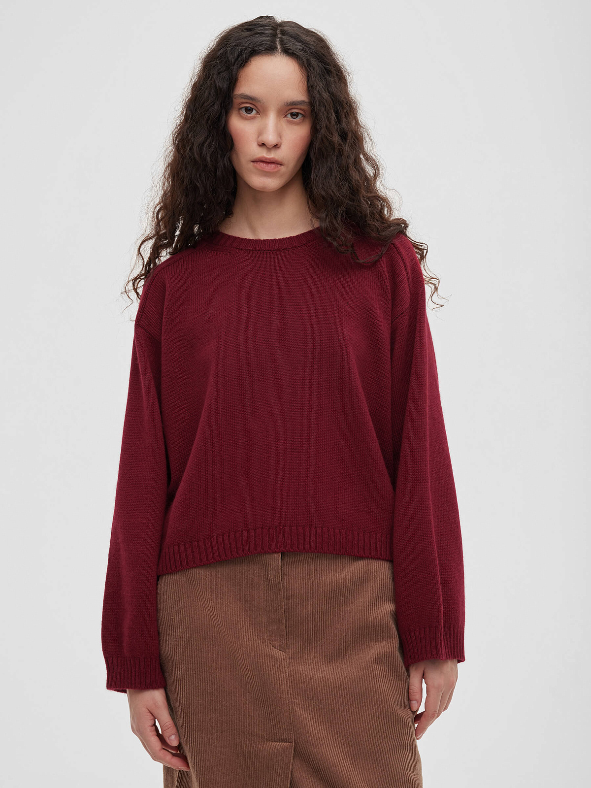 Джемпер свободного кроя с круглым вырезом горловины, цельной линией плеча по спинке и широкими рукавами. Изготовлен из смесовой пряжи улучшенных свойств. Комбинация пуха ангорского кролика и тонкой шерсти в составе создают текстуру с характерным ворсом.