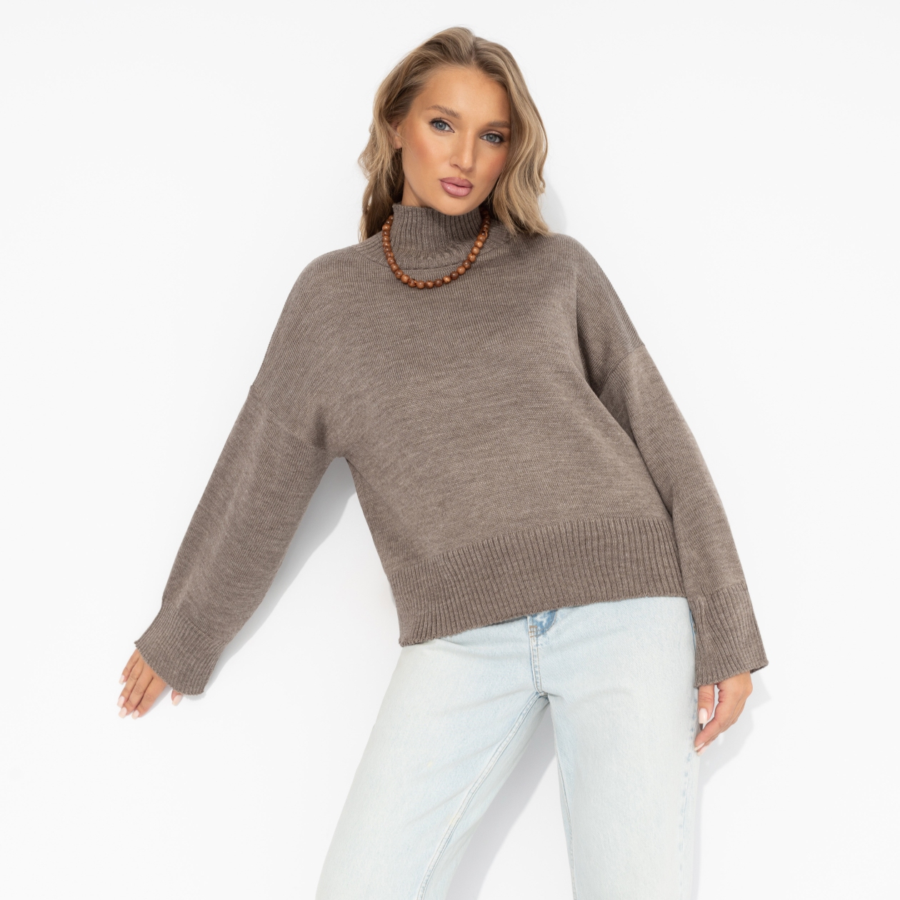 Новая глава твоего комфорта. Мягкий вязаный трикотаж обнимает, как тёплое утро с чашкой кофе. Лаконичный силуэт, благородный беж и свобода в каждом движении. Джемпер свободного кроя из мягкого вязаного трикотажа с добавлением шерсти. Воротник-стойка. Спущенная линия плеча создаёт расслабленный силуэт, подчёркивая непринуждённость образа.