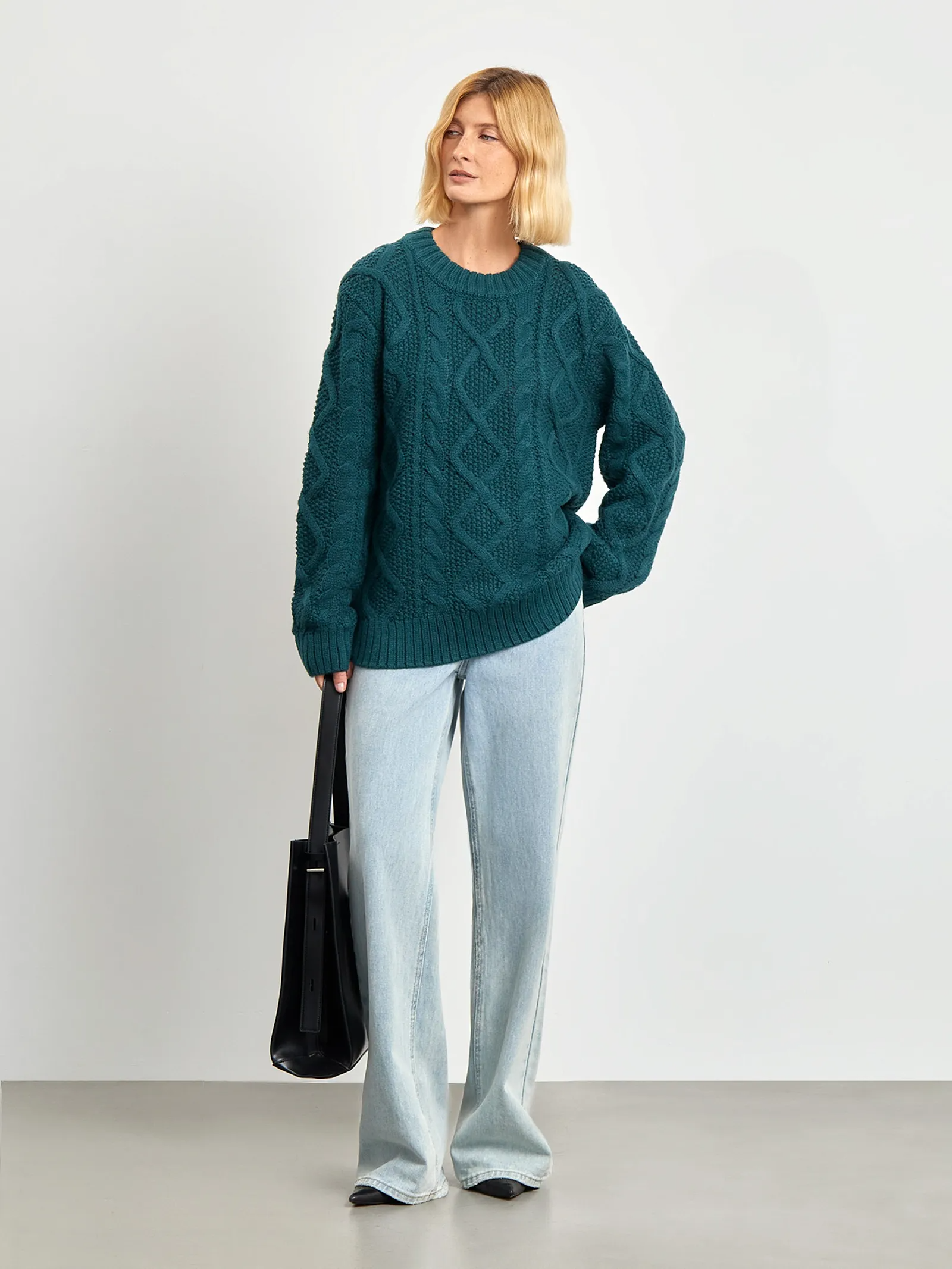 Актуальный свитер крупной вязки с косами. Выполнен в бирюзовом цвете из материала с содержанием натуральной шерсти. Модель с круглой горловиной и спущенным плечом имеет удлинённые рукава.