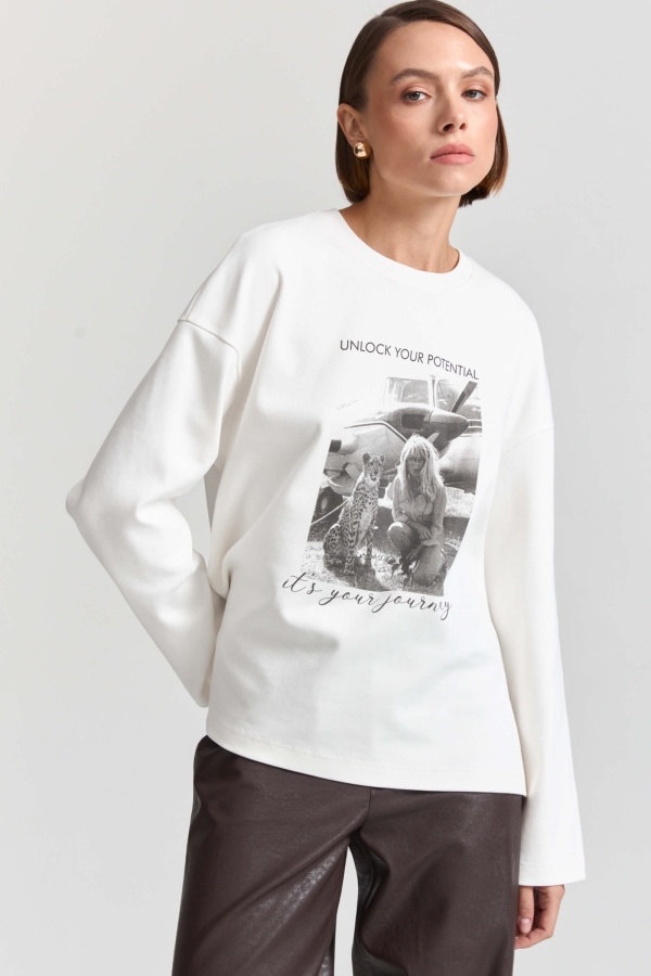 Комфортный лонгслив из материала “интерлок” с авторским принтом. Модель свободного силуэта со спущенной линией плеч. Перевод принта: “Раскройте свой потенциал. Это ваше путешествие.”