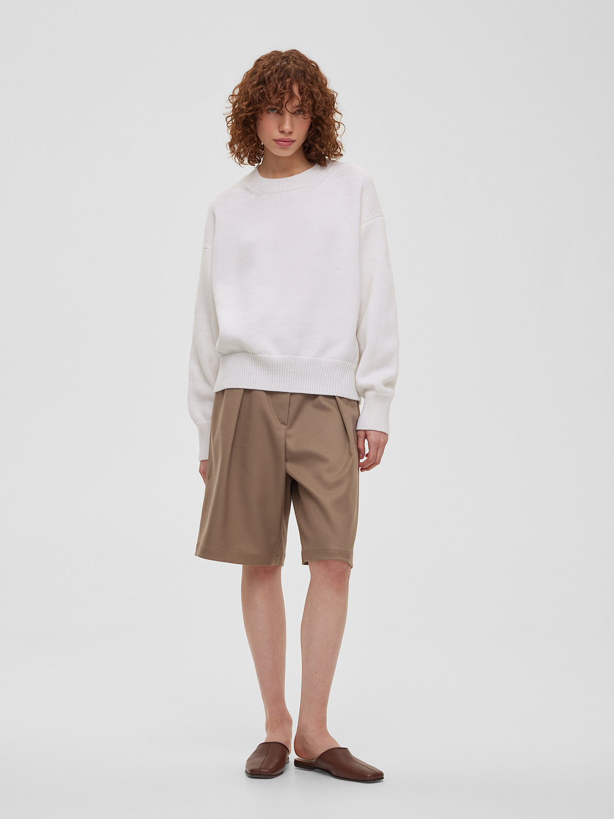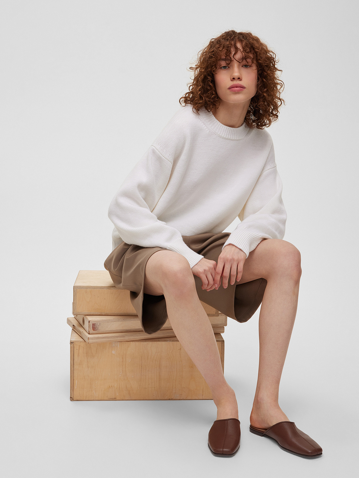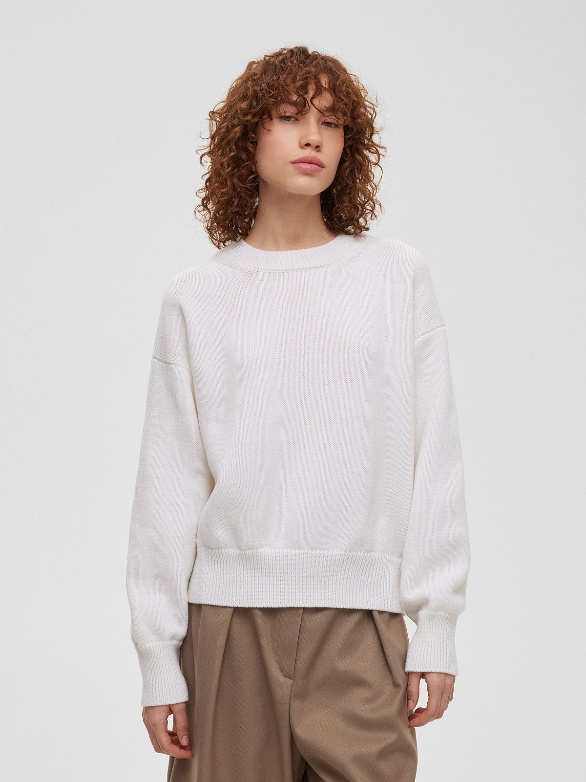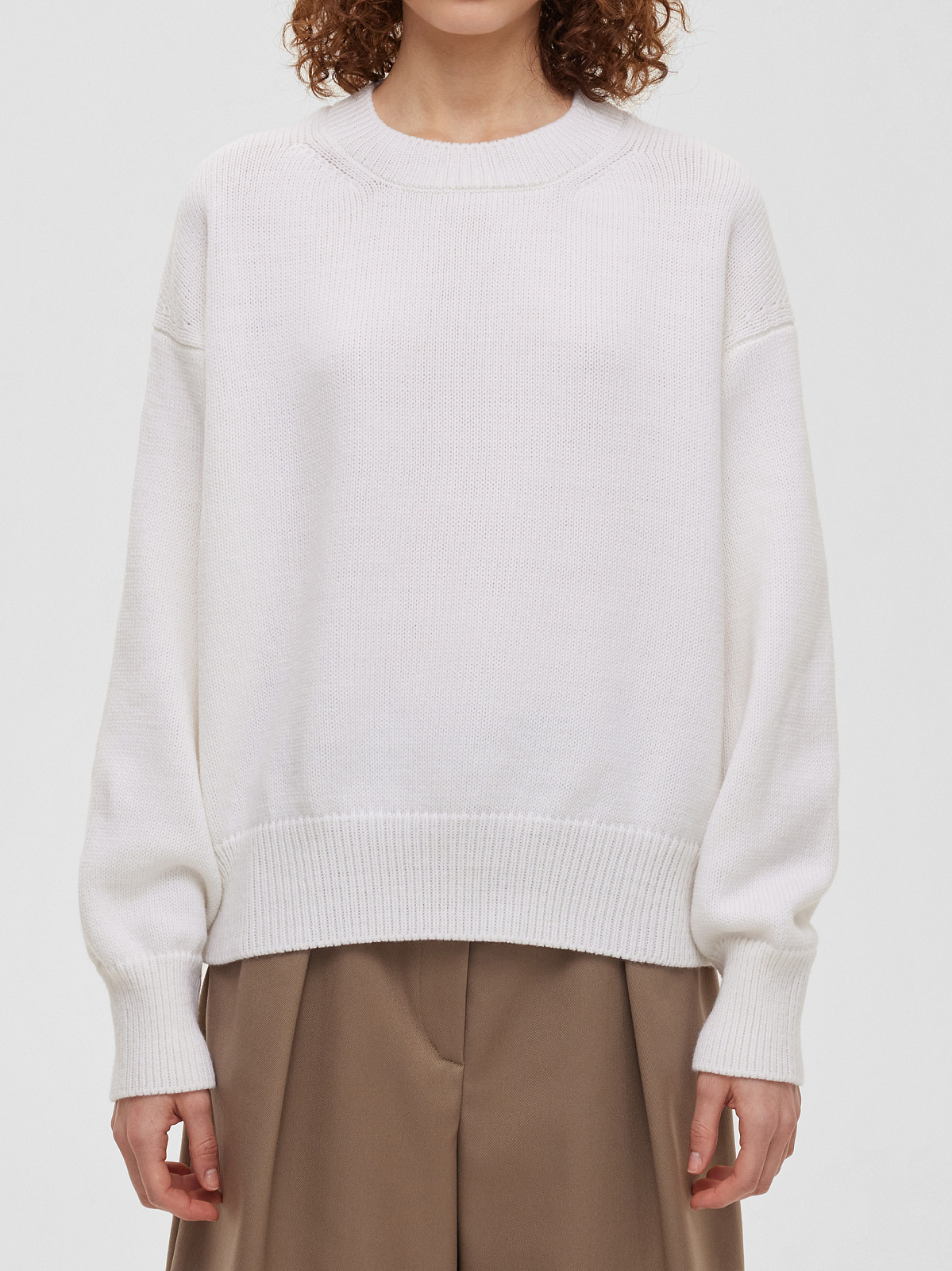 Джемпер свободного кроя с круглой горловиной и мягкой линией плеча — одна из самых любимых базовых моделей Aim Clo, к которой клиенты возвращаются снова и снова, выбирая её в разных оттенках. Спокойный силуэт и комфортная посадка делают его надёжной частью повседневного гардероба.