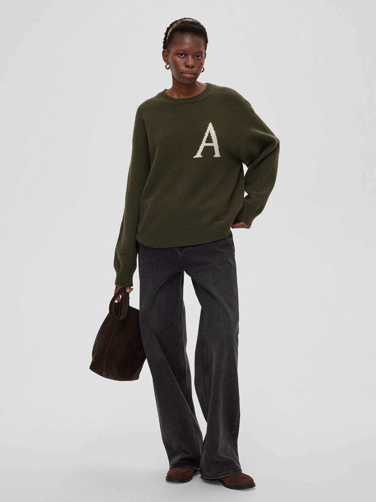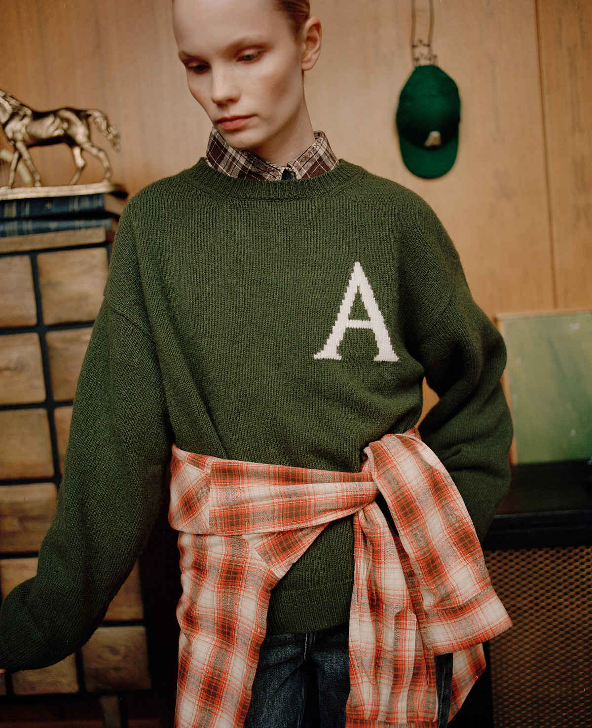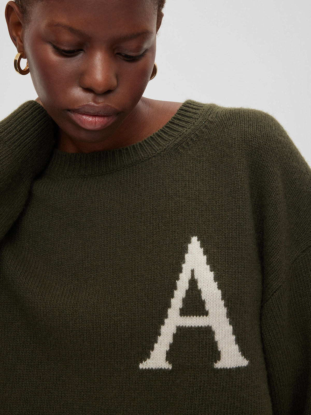 Джемпер выполнен в колледж-стиле и украшен вывязанной буквой "А" с использованием техники "интарсия". Его универсальная модель включает спущенную линию плеча, круглый вырез горловины и резинки на рукавах и по низу, что обеспечивает комфортную посадку для любой фигуры.