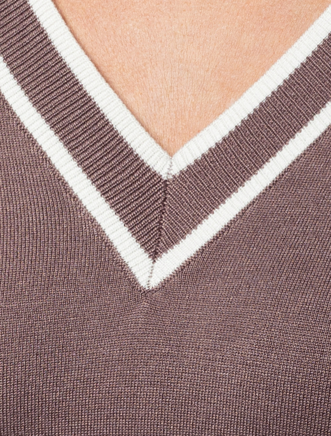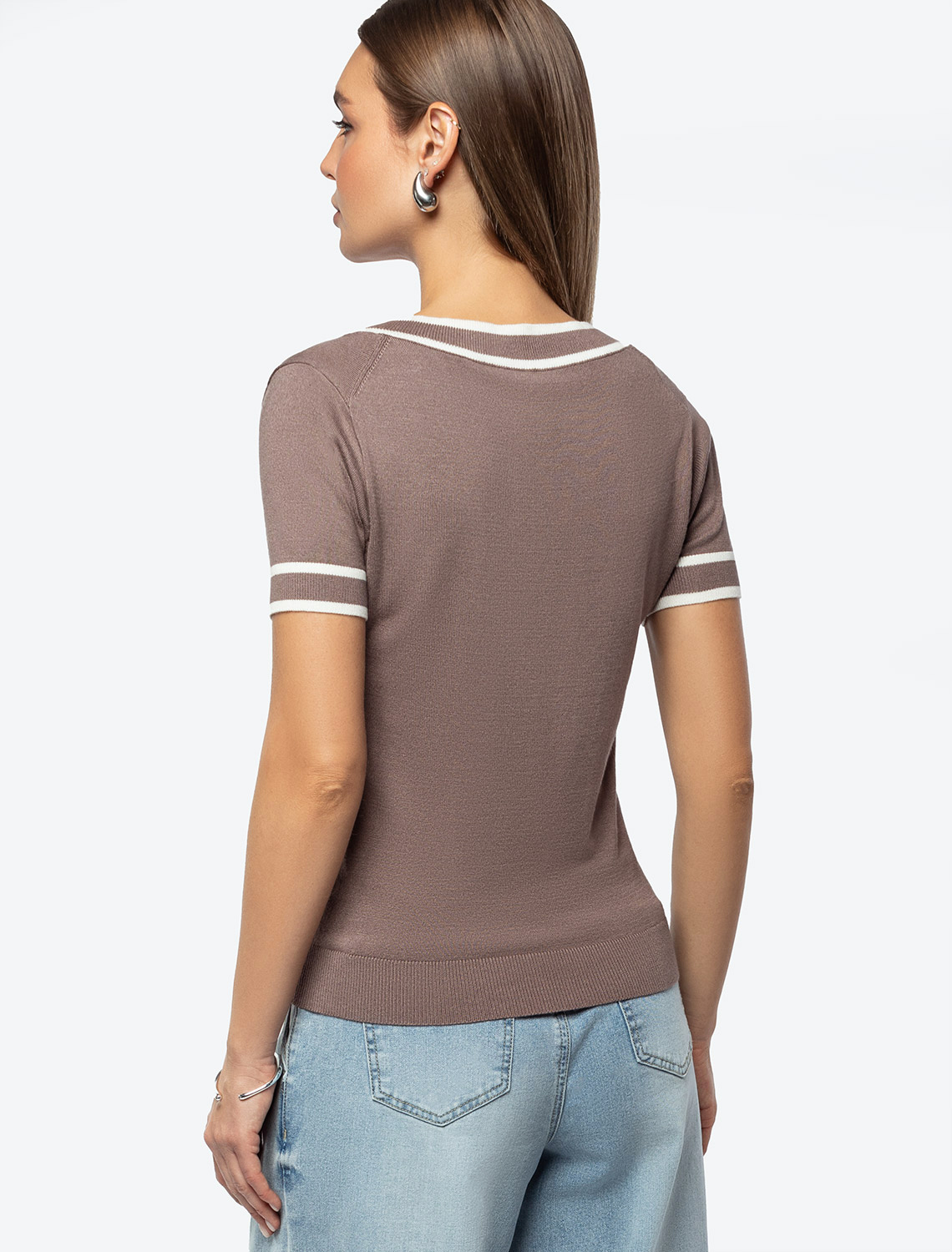 Джемпер тонкой вязки с V – вырезом выполнен из вискозы с нейлоном. Мягкая пряжа приятная к телу дарит настоящий комфорт в любое время года. Модель хорошо сидит по фигуре не сковывая движений. Впишется в любой гардероб. Из украшений фирменный логотип бренда. 80%Вис 20%ПА