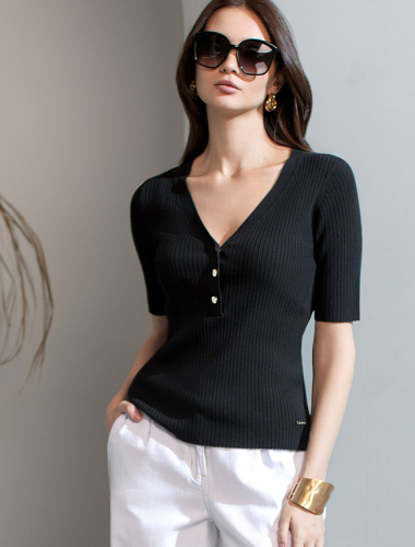 Джемпер тонкой вязки из вискозы с нейлоном. Для производства изделия использована пряжа сердечникового прядения — когда нейлоновая нить (основа) обвивается вискозой. Вискоза обеспечивает приятную тактильность и гигроскопичность, а нейлон предотвращает растяжение и повышает устойчивость к пилингуемости. Модель с V- вырезом прилегающего силуэта дополнена золотистыми пуговицами. Изделие дополнено фирменным металлическим логотипом бренда.
