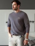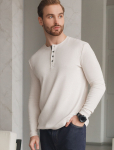 Черный джемпер с воротом, застегивающимся на черепаховые пуговицы, связали из мягкого хлопка с добавлением акрила; состав, который отлично согревает, не колется и при этом не перегревает тело, поэтому вещь получилась максимально комфортной для переменчивой погоды. Повседневный образ поддержат светлые брюки, синие джинсы и броги.