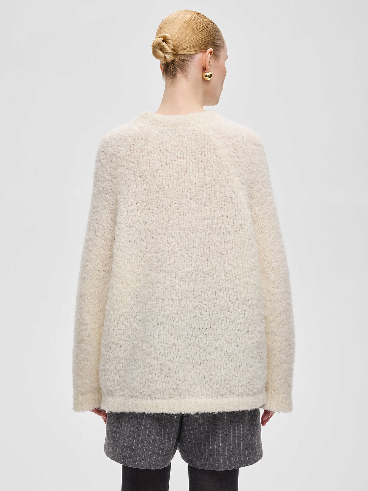 Удлинённый силуэт позволяет носить джемпер как самостоятельную вещь или собирать его в комплект с брюками и юбками букле из альпаки и шерсти Aim Clo. Форма остаётся спокойной и сбалансированной, оставляя фактуре ведущую роль в образе.