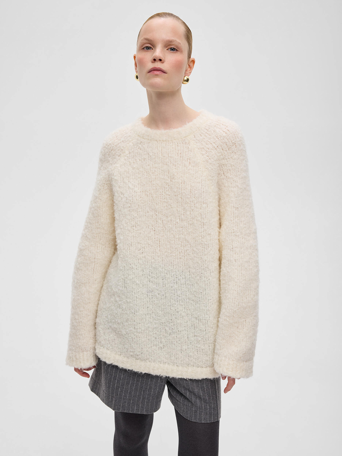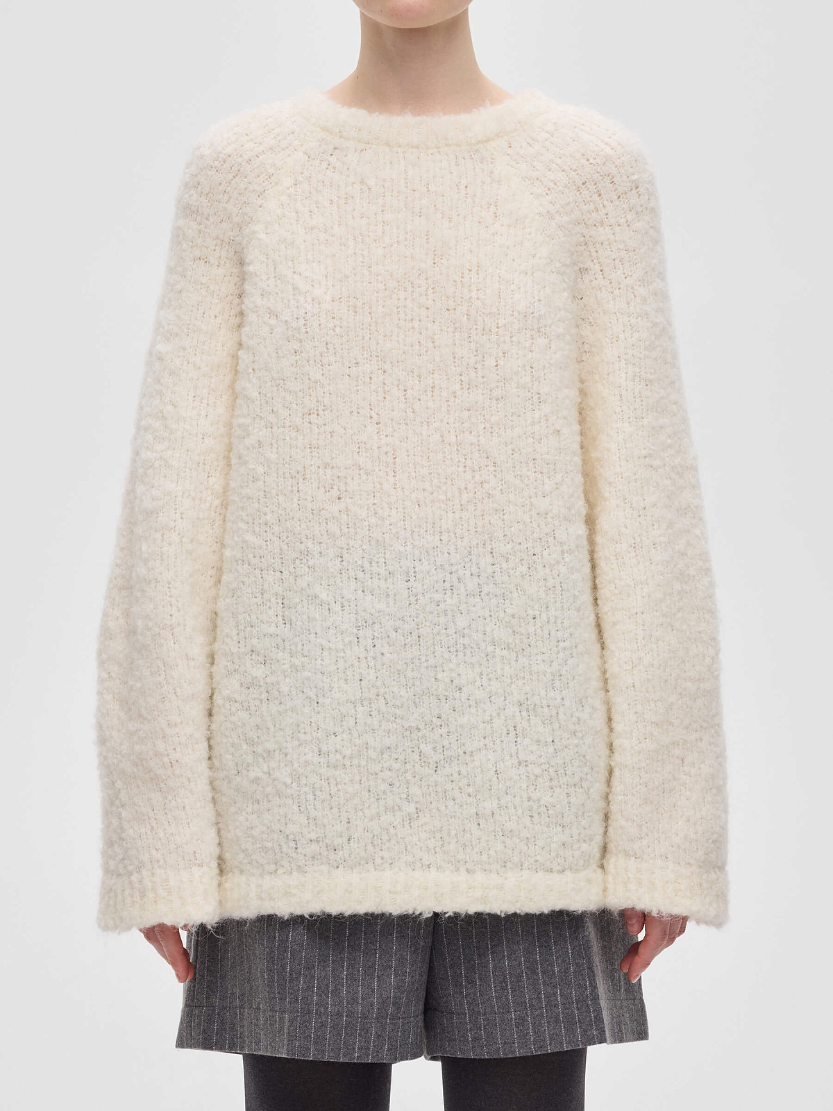 РОЗНИЧНАЯ ЦЕНА 9850руб. Удлинённый джемпер с круглой горловиной и рукавами реглан выполнен из смесовой пряжи с альпакой и шерстью. Фактура букле формирует живую, объёмную поверхность, которая сразу задаёт характер модели и делает её визуально выразительной.
