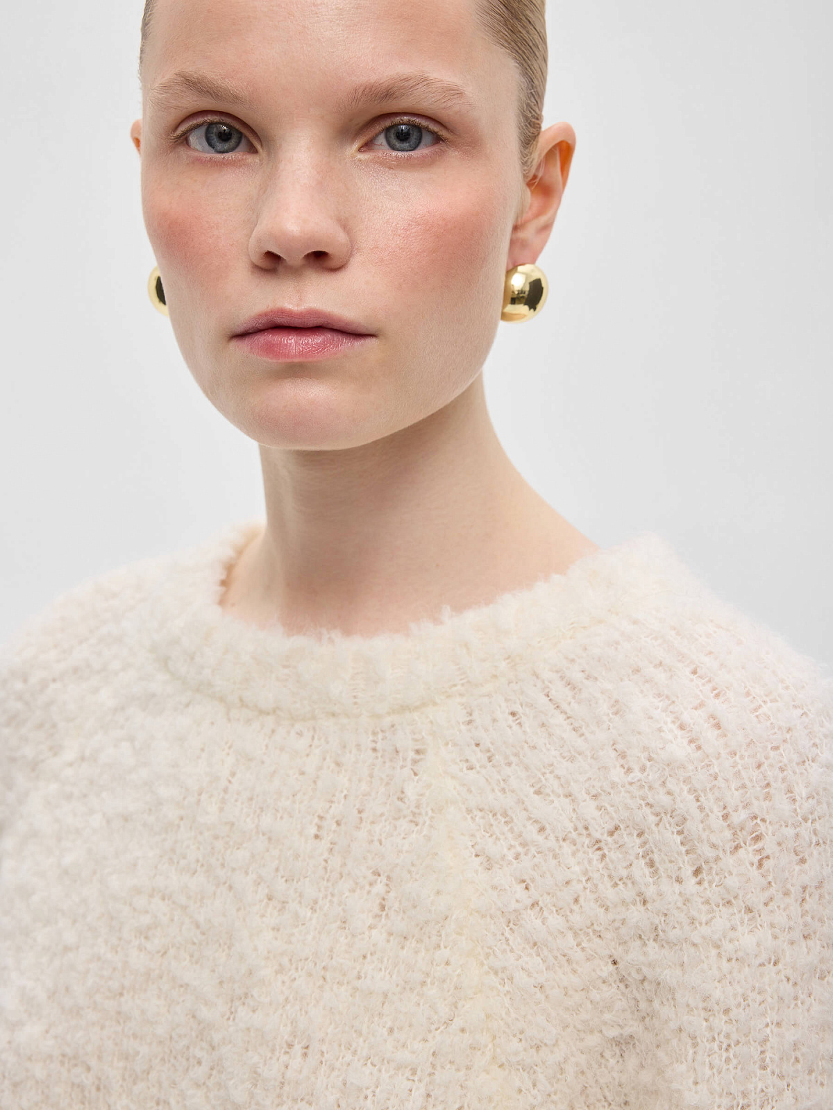 Удлинённый джемпер с круглой горловиной и рукавами реглан выполнен из смесовой пряжи с альпакой и шерстью. Фактура букле формирует живую, объёмную поверхность, которая сразу задаёт характер модели и делает её визуально выразительной.