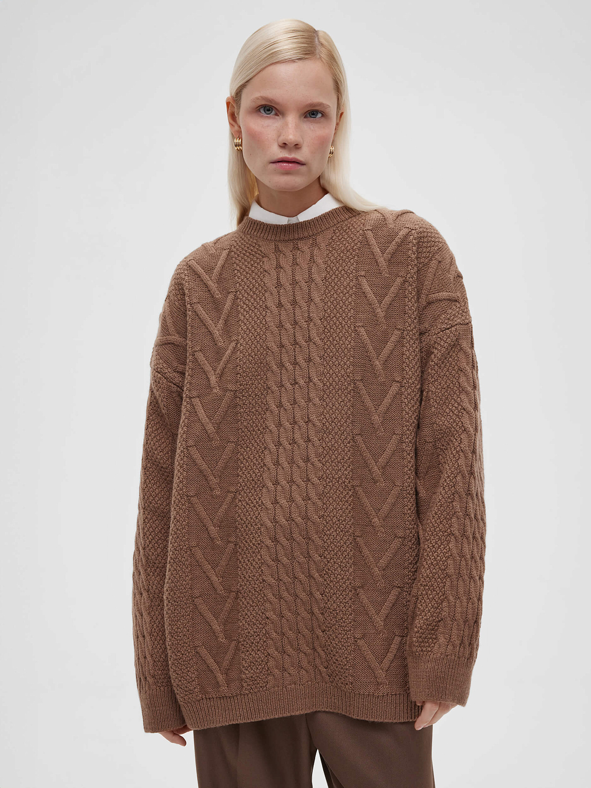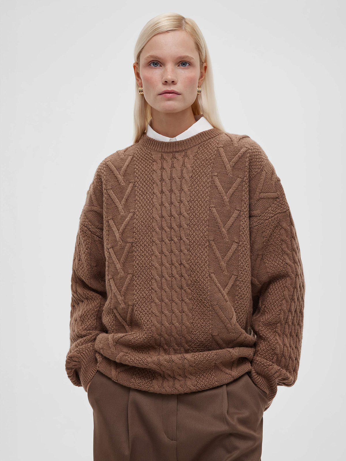 Джемпер удлиненного кроя из шерсти с фактурным плетением косами и круглым вырезом.