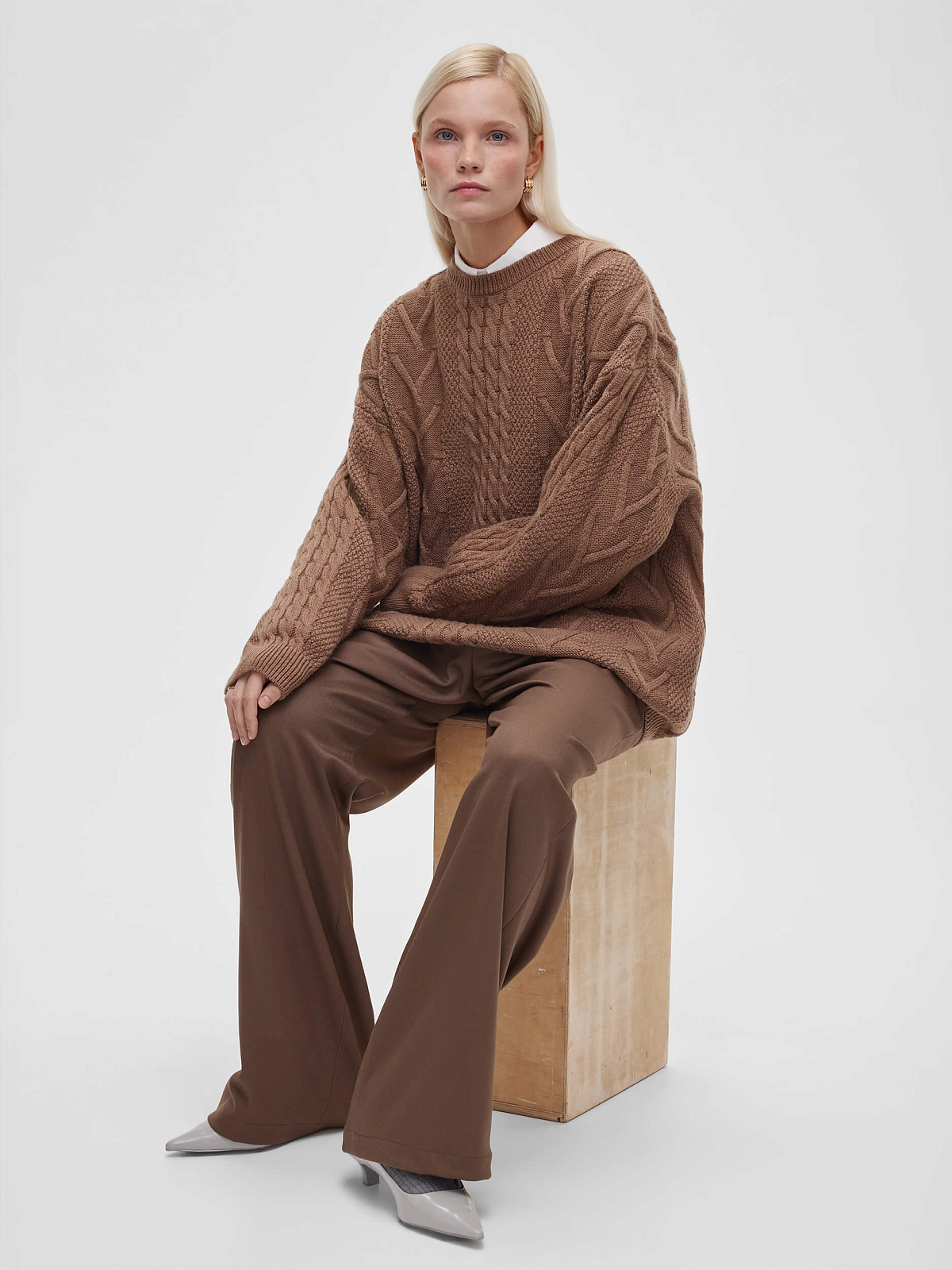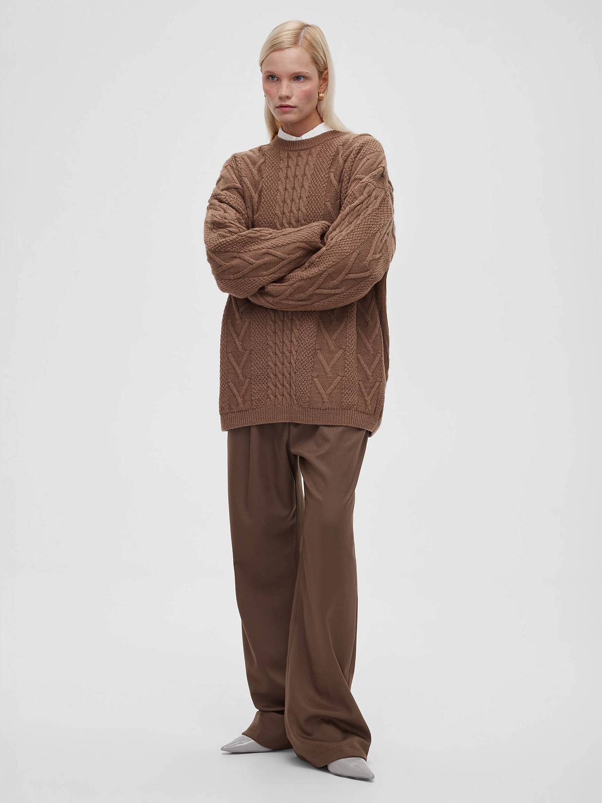 Джемпер удлиненный с косами, кофейный