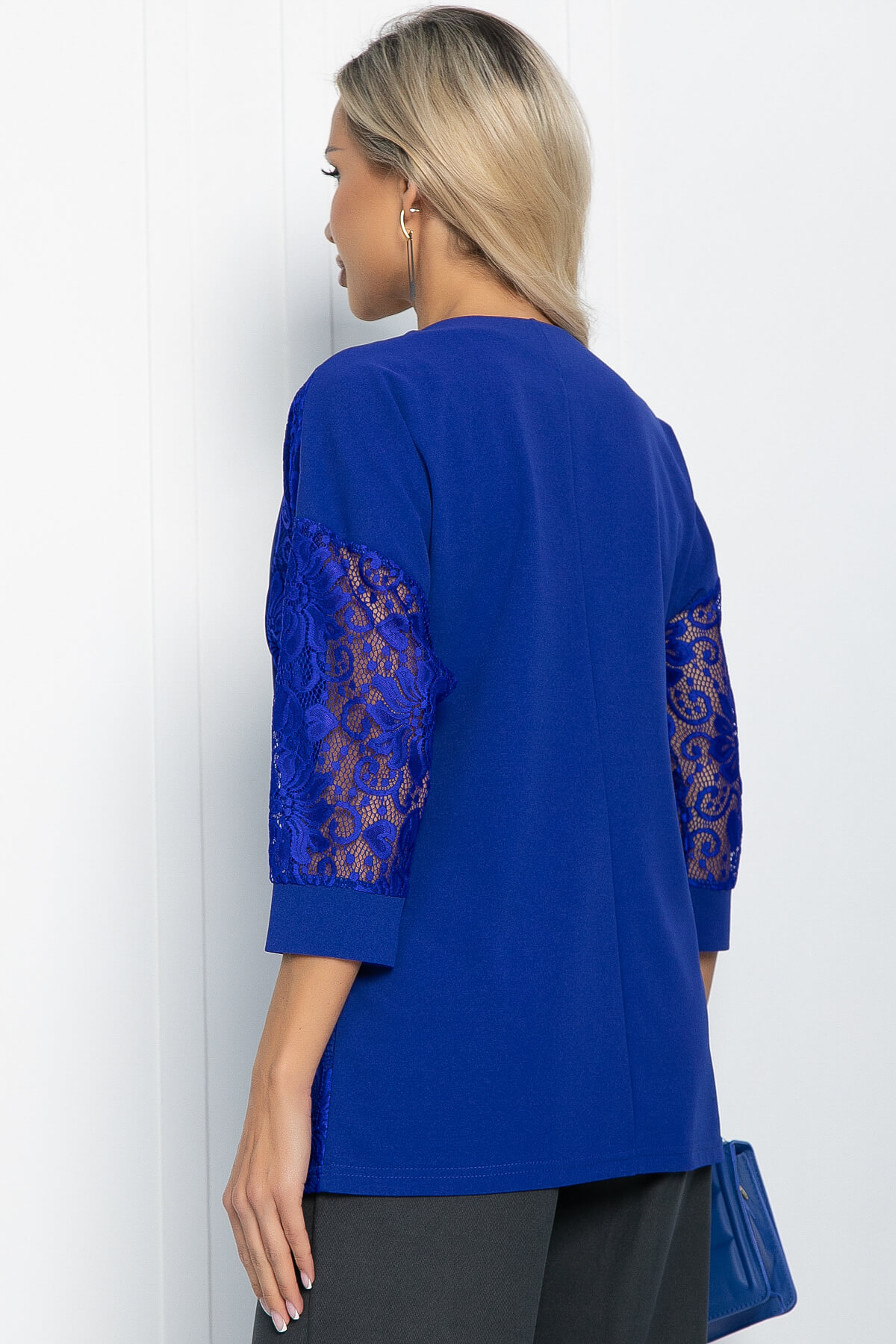 В вашем гардеробе прекрасно будет смотреться трикотажный джемпер свободного кроя в синем цвете. Простой и лаконичный силуэт этой модели отлично сочетается с любой базовой одеждой. Свободный крой деликатно скрывает недостатки фигуры. Джемпер имеет втачной рукав со спущенной линией плеча и длину 3/4. Контрастный акцент в изделии создают кружевные вставки.