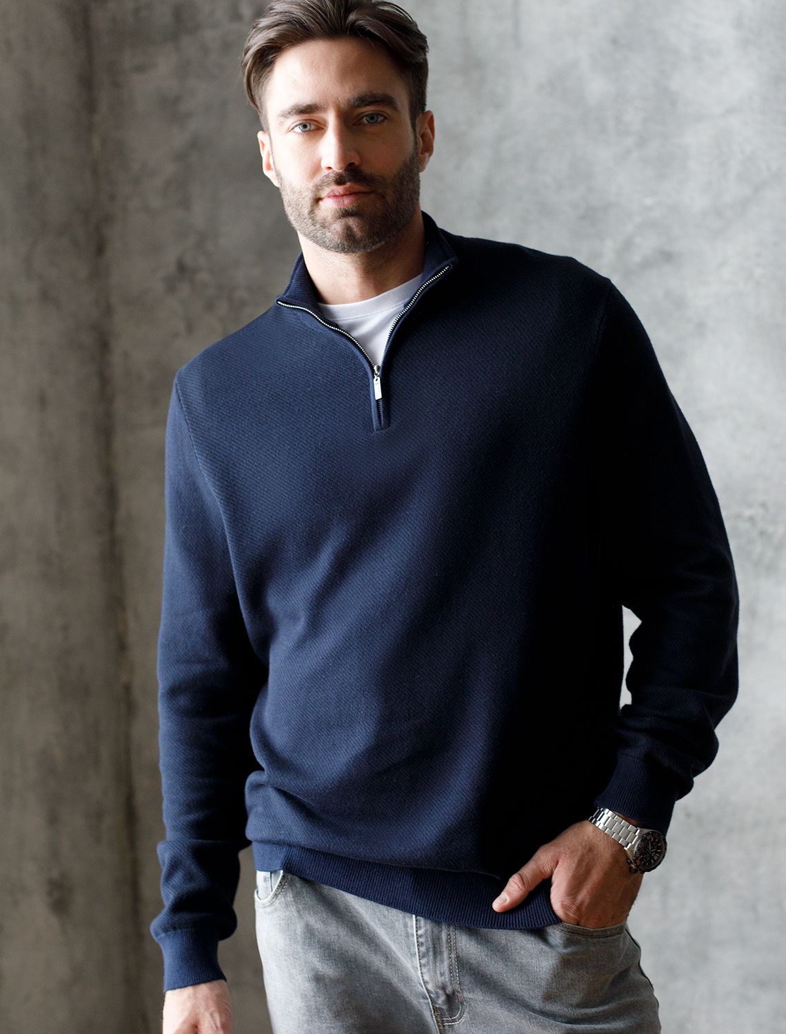 Темно-синий джемпер с длинными рукавами выполнен из мягкой хлопковой пряжи с добавлением акрила. Высокий воротник застегивается молнией. За счет переплетения светлых и темных нитей получилась фактурная меланжевая модель, которая, отлично держит тепло и почти не ощущается на теле. Сочетается с футболками, денимом и с чиносами, любой обувью.