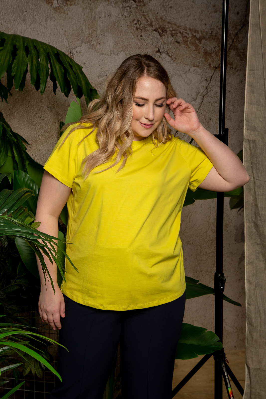 Состав: 95%хлопок, 5% лайкра. Материал: трикотаж кулирная гладь. Цвет: лаймовый. Силуэт: Прямой. Рукав: втачной одношовный короткий. Горловина: Круглая,втачана бейка. Длина: до середины бедра.