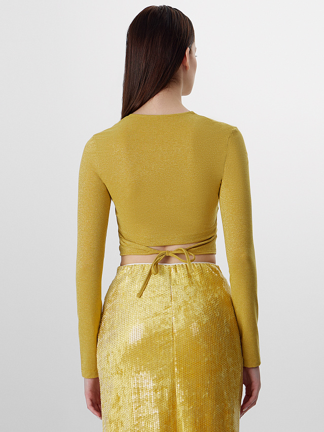 Укороченный джемпер создает эффектный и женственный образ для особенного выхода. Прилегающий силуэт мягко подчеркивает линии фигуры, а крой с завышенной талией визуально вытягивает силуэт.